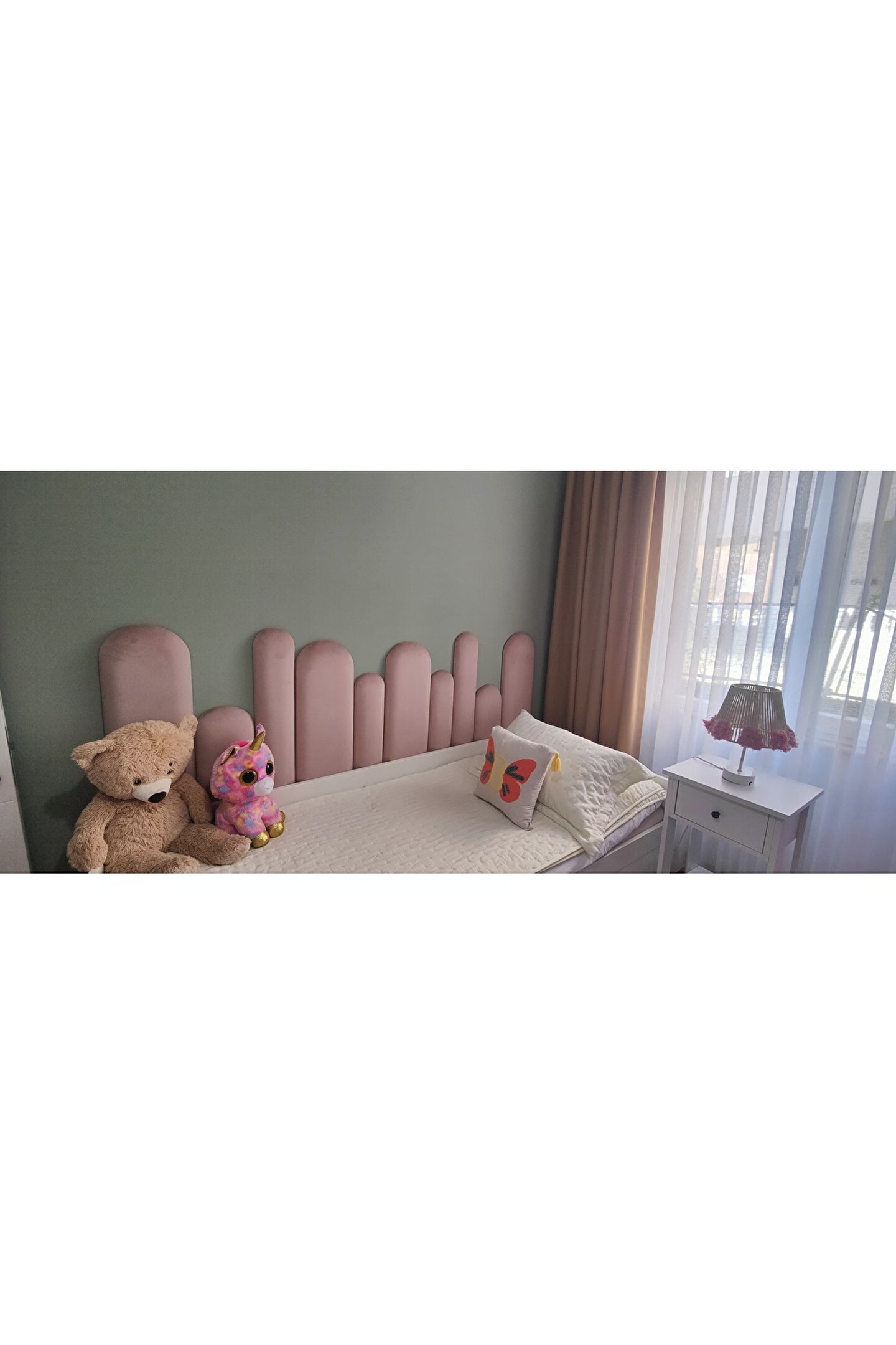 • Oval üst kısımlı Yatak başlığı fayansları-Çocuk yatak odaları için dekoratif döşemeli duvar panelleri.