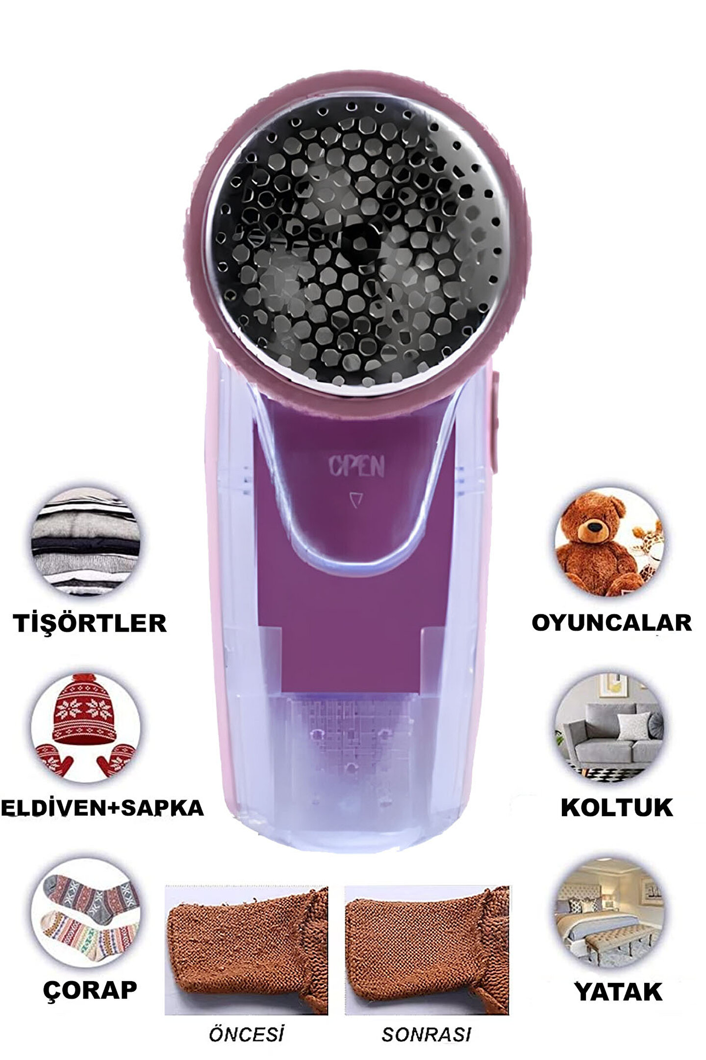 Ürün Açıklaması: Kullanım Alanları: Ceket, kazak, kanepe, halı, yünlü, perde ve battaniyelerdeki tüy ve havları temizler. ; Bıçaklar: Döner keskin paslanmaz çelik bıçaklar, tüyleri hızlı ve etkili bir şekilde yok eder. ; Doku Koruma: Dokuları yumuşak bir şekilde düzgünleştirir ve tüyleri hızlı bir şekilde yok eder. ; Tüy Deposu: Şeffaf tüy deposu ile kolay takip ve boşaltma. ; Koruyucu Kapak: Dahildir, kullanım sırasında güvenliği artırır. ; Temizlik Fırçası: Kolay temizlik için temizleme fırçası dahildir. ; Güç Kaynağı: Lüks şarjlı model, kablosuz kullanım rahatlığı sağlar. ; Bu makine, giysi ve ev eşyalarınızın bakımını kolaylaştırarak tüy ve havlardan arındırmak için idealdir. ; Şeffaf tüy deposu sayesinde temizlik zamanı geldiğinde hemen fark edebilirsiniz. ; Koruyucu kapak ve temizleme fırçası ile birlikte gelir, böylece makinenizin bakımını da kolayca yapabilirsiniz.;