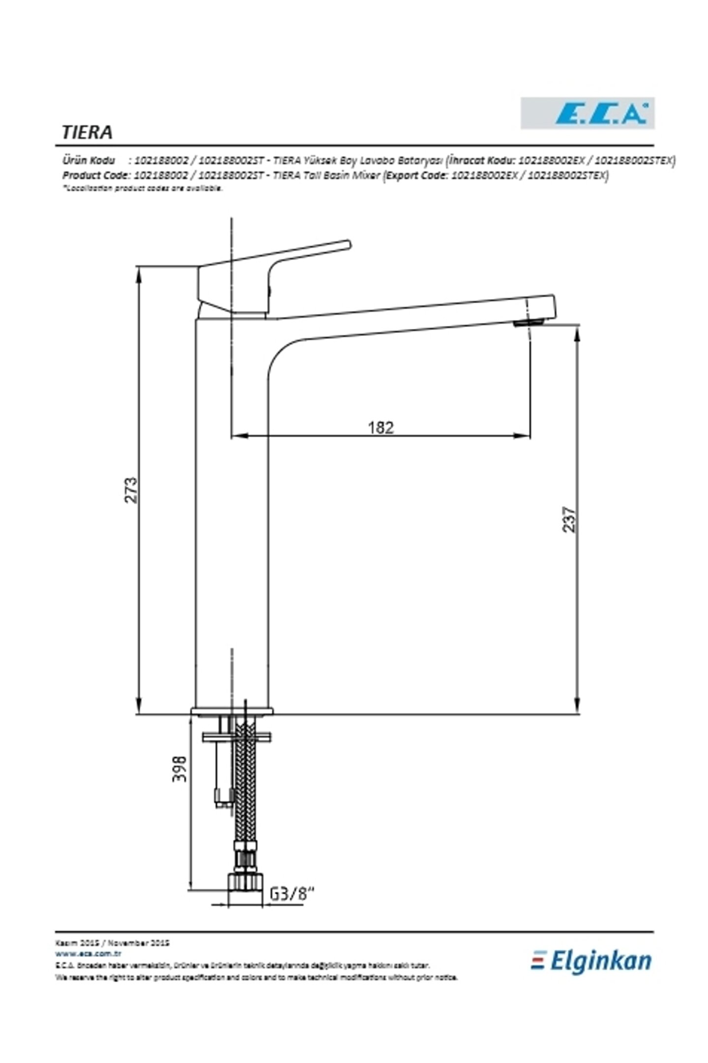 Eca Tiera Yüksek Tip Lavabo Bataryası Çıkış ucu uzunluğu 182 mm'dir; Çıkış ucu yüksekliği 237 mm'dir; Kireç kırıcılı gizli perlatör; 3 bar basınçta su akış miktarı dakikada maksimum 6,9 lt;