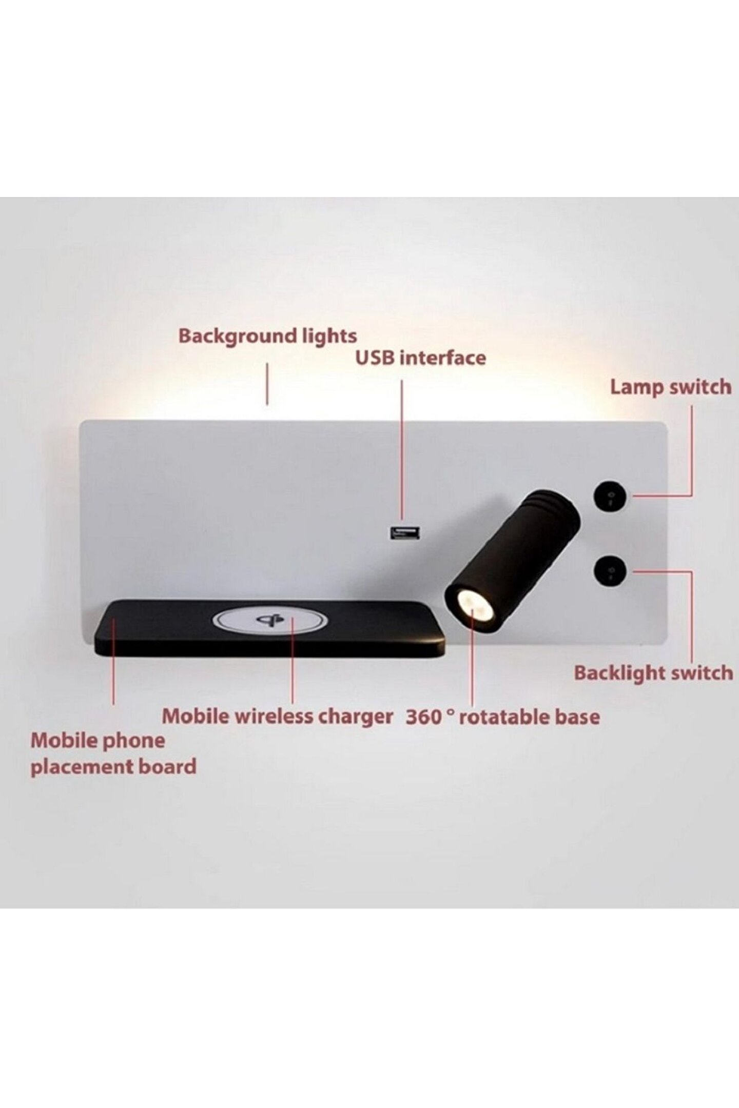 YATAK BAŞI LED APLİK KABLOSUZ ŞARJ OKUMA LAMBASI BEYAZ KASA GÜNIŞIĞI IŞIK ECN-7701 KABLOSUZ ŞARJ ÖZELLİĞİ 360 DERECE DÖNEBİLEN OKUMA LAMBASI KABLOLU ŞARJ EDEBİLME ÖZELLİĞİ GİZLİ AYDINLATMASI GECE LAMBASI OLARAK KULLANILABİLİR İÇ MEKAN KULLANIMA UYGUN OLAN YATAK BAŞI LED APLİK ÇOK MARİFETLİ BİR ÜRÜNDÜR :) -KABLOSUZ ŞARJ ÖZELLİGİ OLAN BÜTÜN CİHAZLARI ŞAR EDİYOR