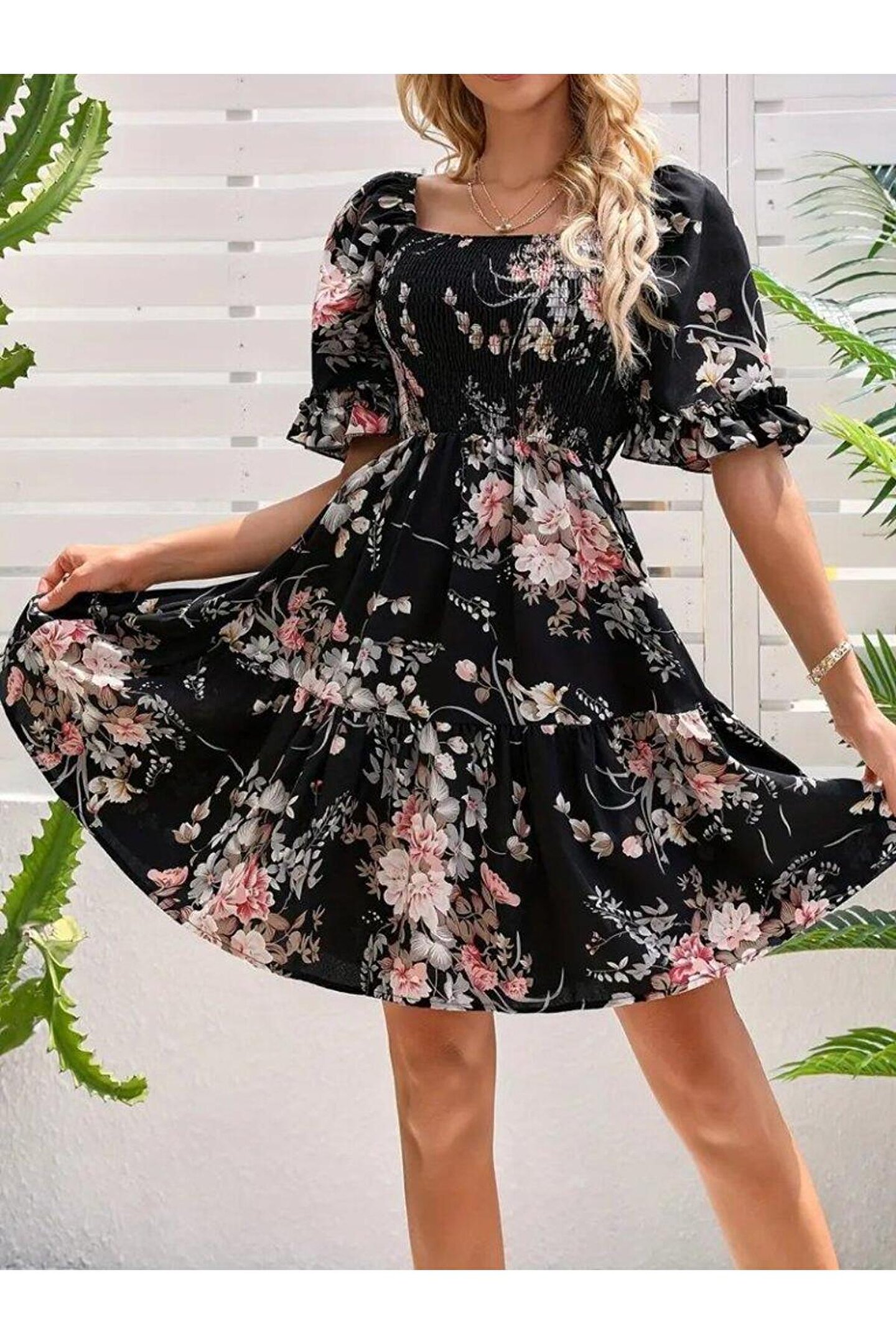 Kadın Kısa Kollu Kare Yakalı Beli Lastikli Kısa Süprem Elbise