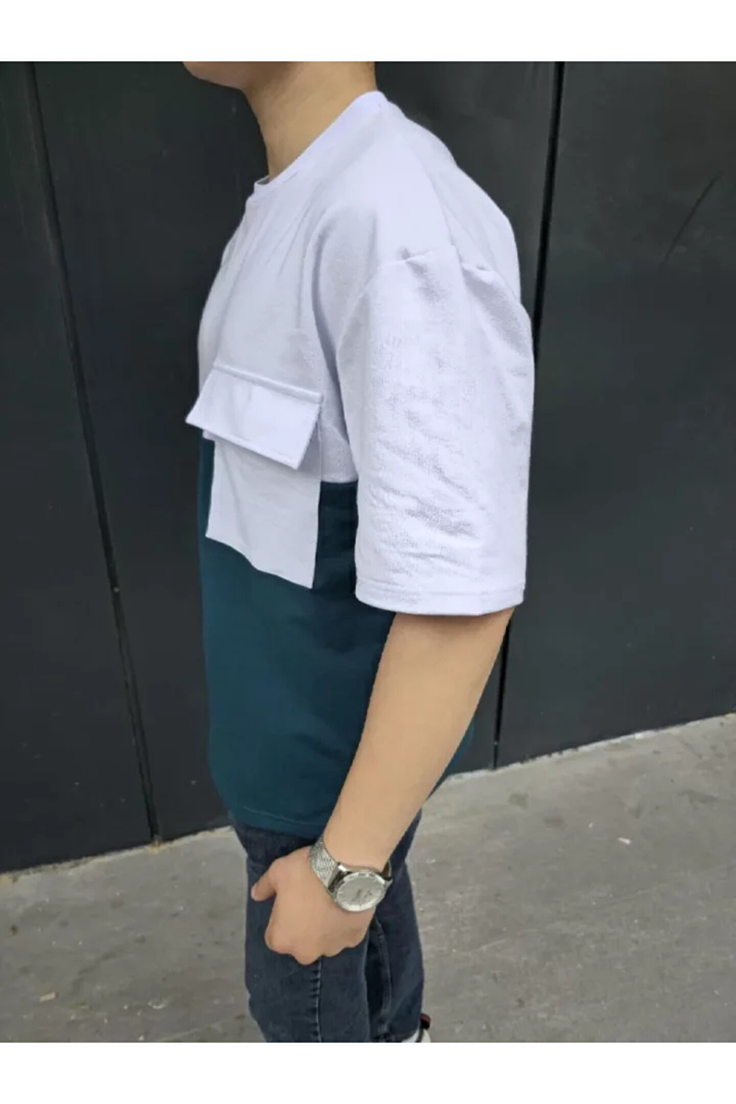 Unisex Torba Cep Detaylı Parçalı T-Shirt - Lacivert