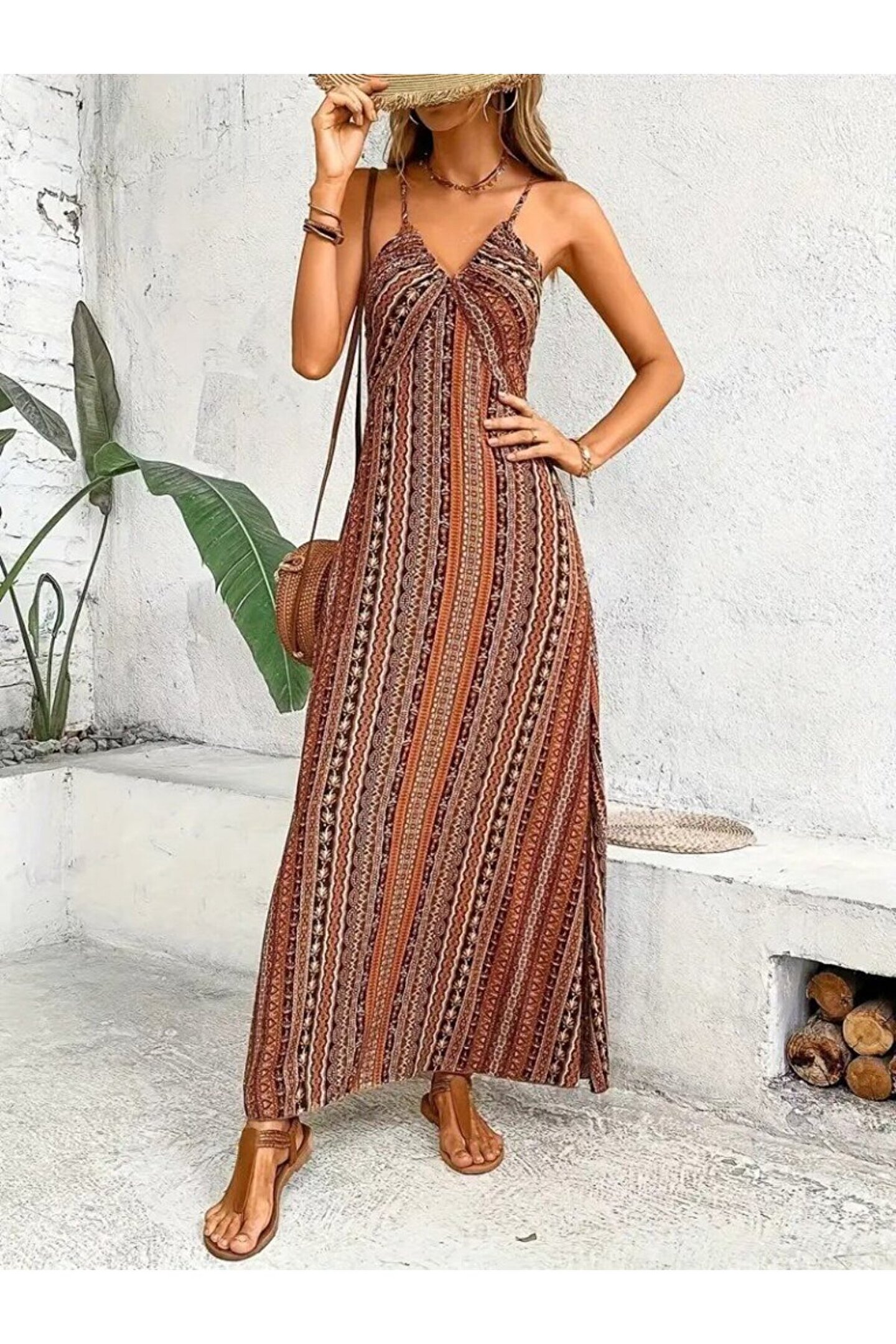 Kadın Ip Askılı Sırttan çapraz Detaylı Yırtmaçlı Desenli Süprem Elbise