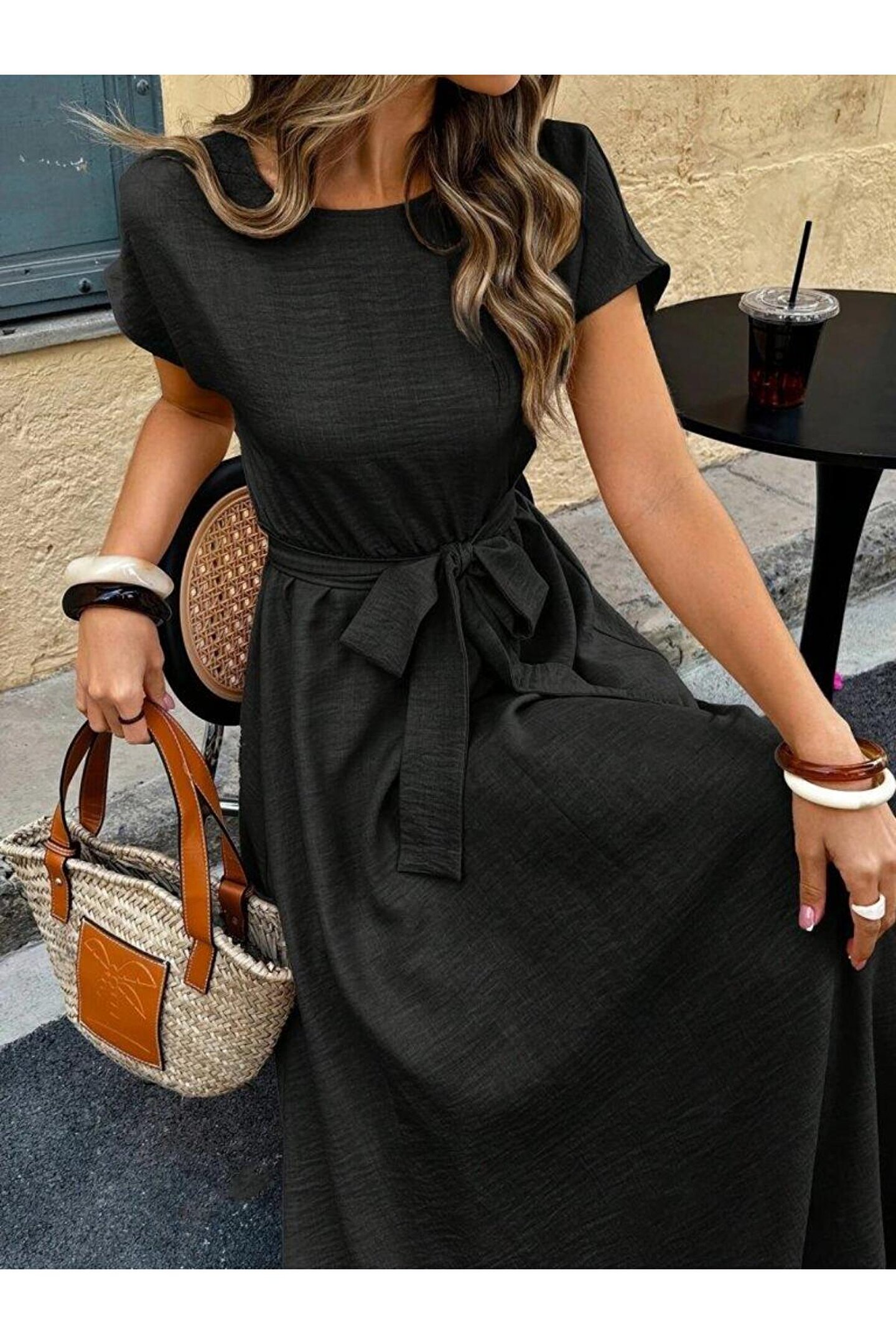 Kadın Kısa Kollu Kayık Yaka Beli Kuşaklı Aerobin Elbise