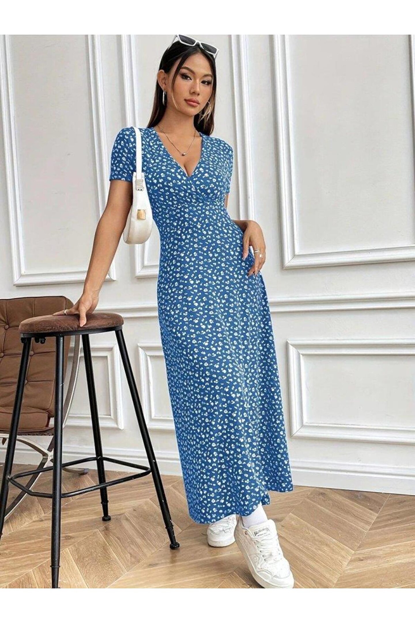 Kadın Kısa Kollu Kruvaze Yakalı çiçek Desenli Süprem Elbise
