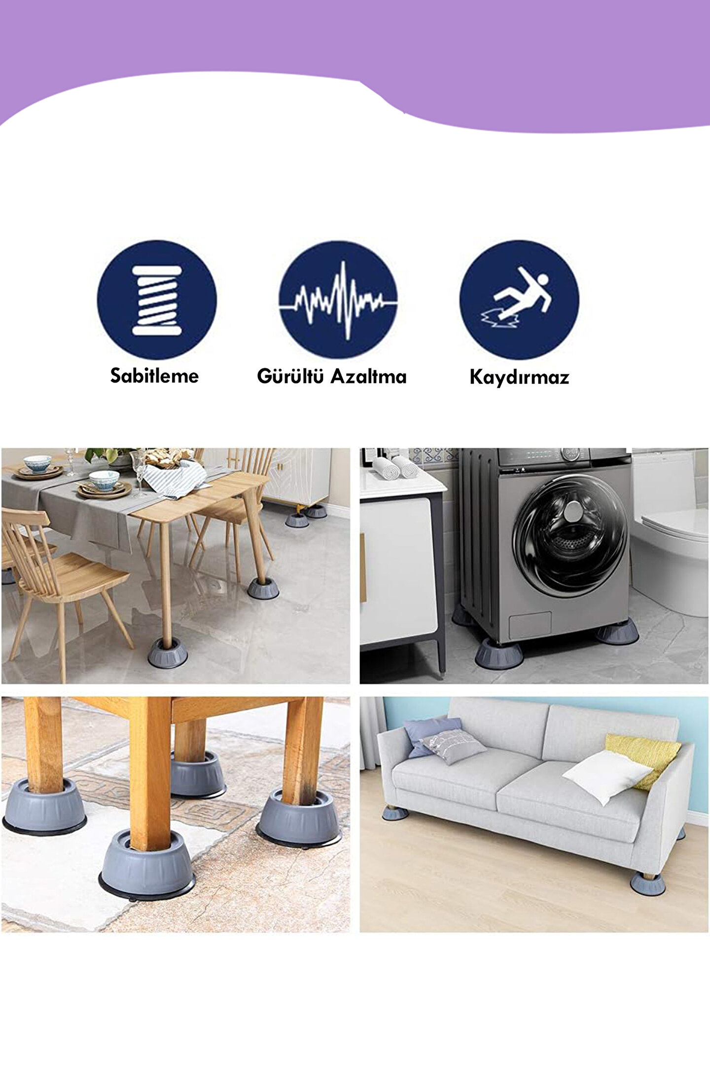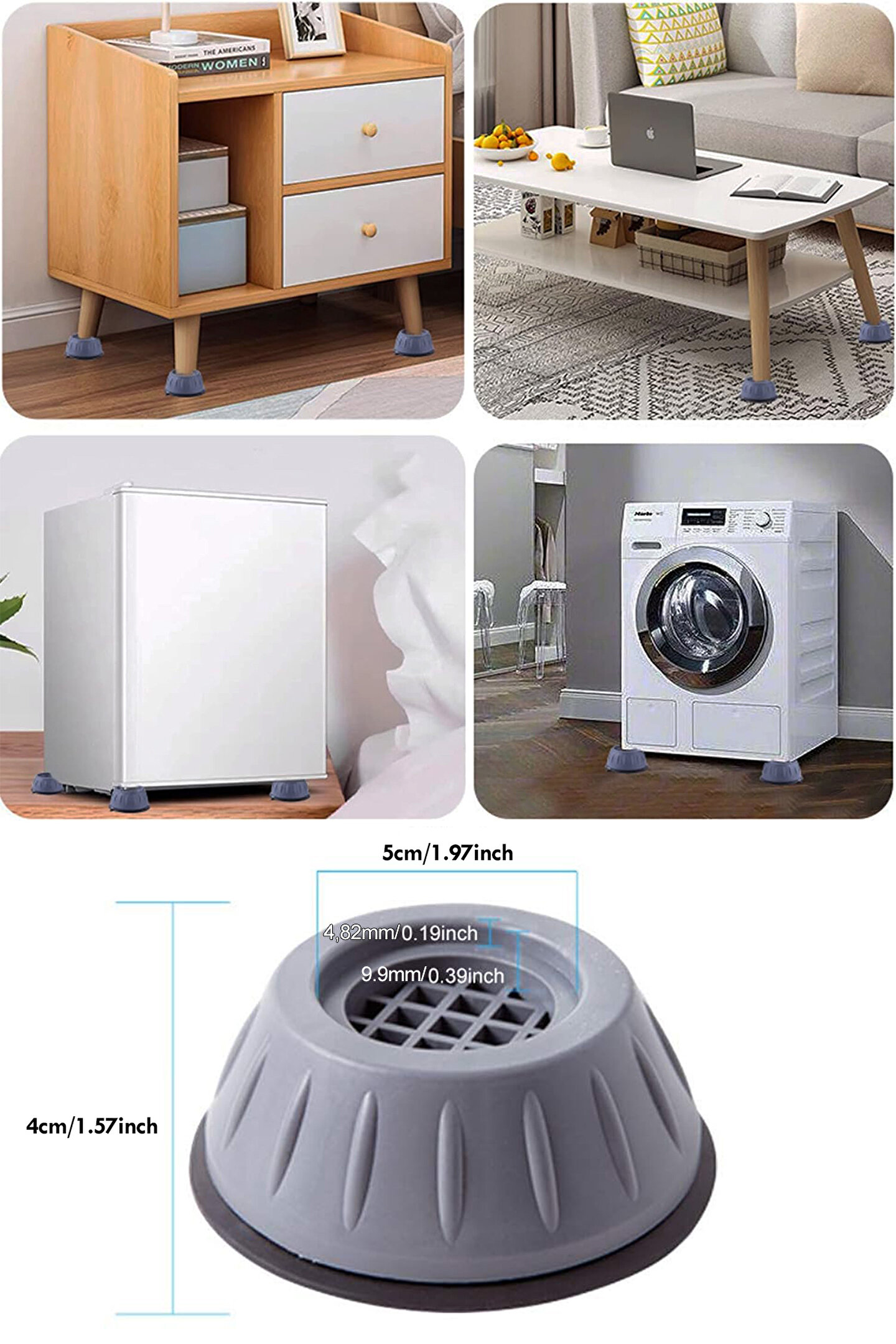 4lü Gürültü emici, kaymaz, titreşim önleyici özel olarak tasarlanmıştır. ; - Çamaşır makinesinde titreşim nedeniyle çamaşır makinesinin kaymasını etkili bir şekilde önler. ; - Kanepe, çamaşır makinesi, yatak, çay masası vb. ; kullanım alanı vardır. ; - Çamaşır makinesini 4 cm yükseltir ve altının kolay temizlemene bilmesine yardımcı olur. ; - Yükseklik: 4 cm Alt Çapı : 8,8 cm - Paket içerisinde 4 adet yükseltici stoper gönderilmektedir.;