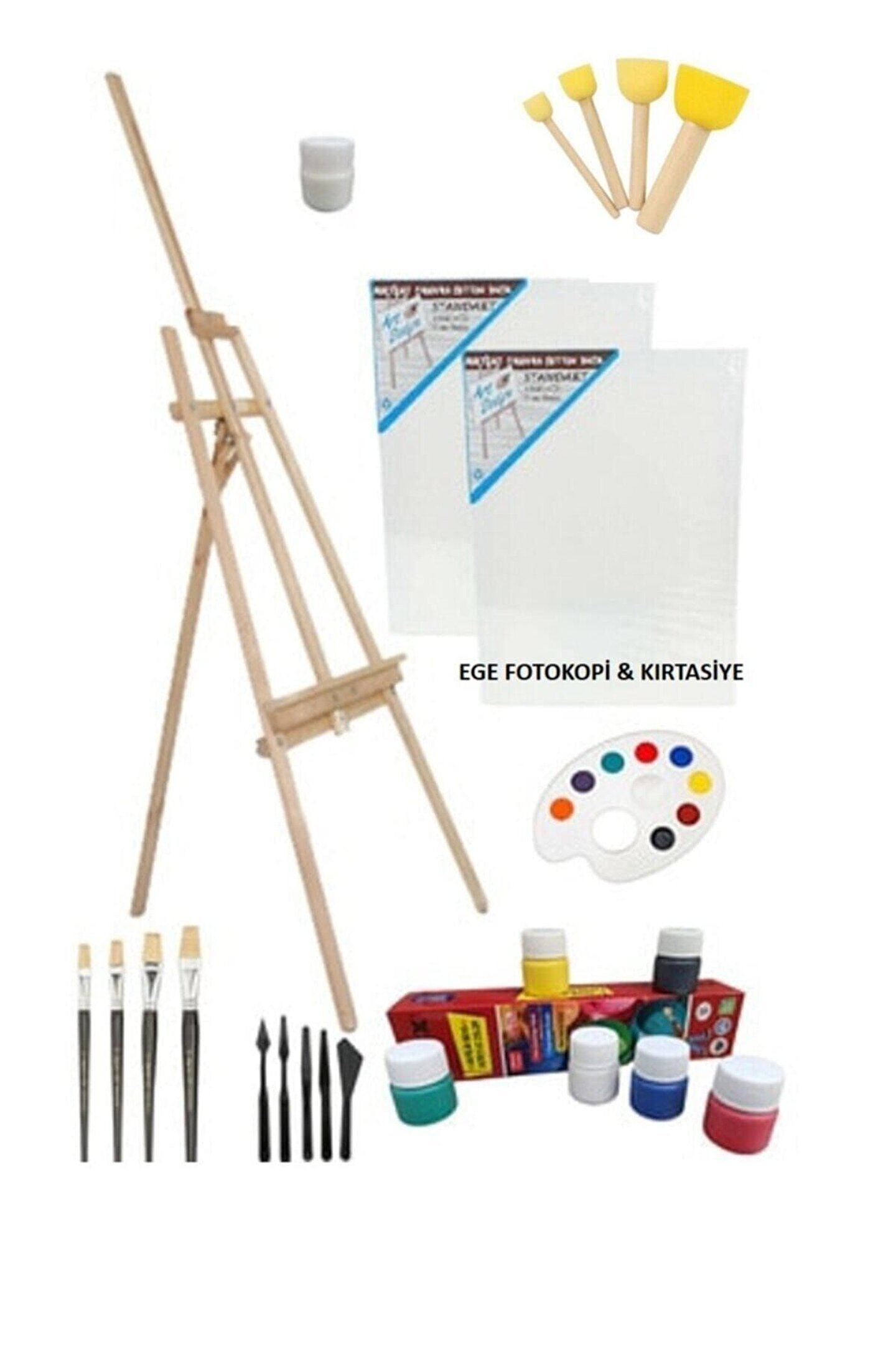 Büyük Boy Ahşap Şövaleli Ekonomik Hobi Seti - Şövale Tuval Boya Spatula Ponpon Fırça Palet Vernik
