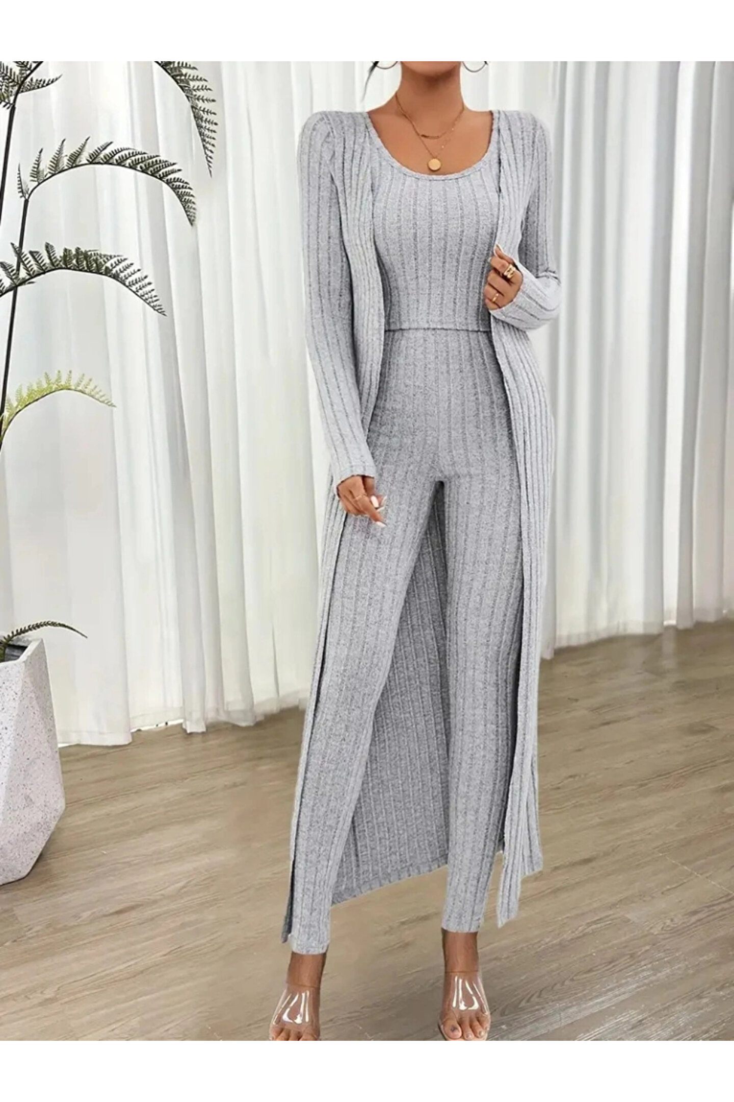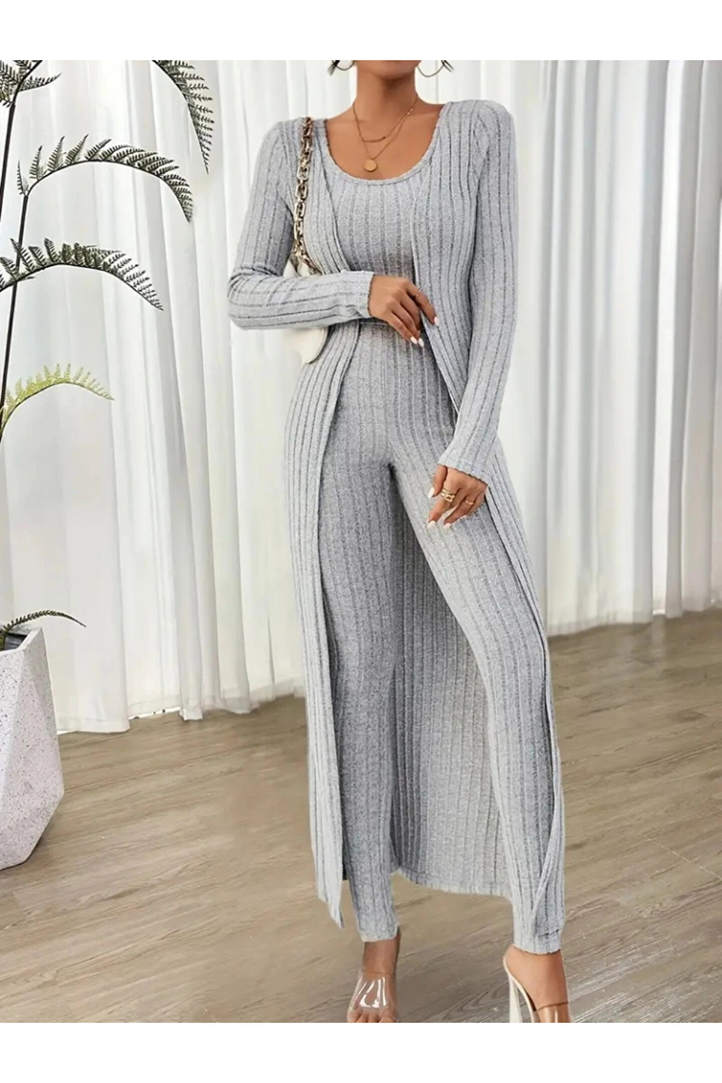 Kadın Yuvarlak Yaka Askılı Krop Bluz Yüksek Bel Tayt Ve Uzun Hırka şardonlu Kaşkorse üçlü Takım