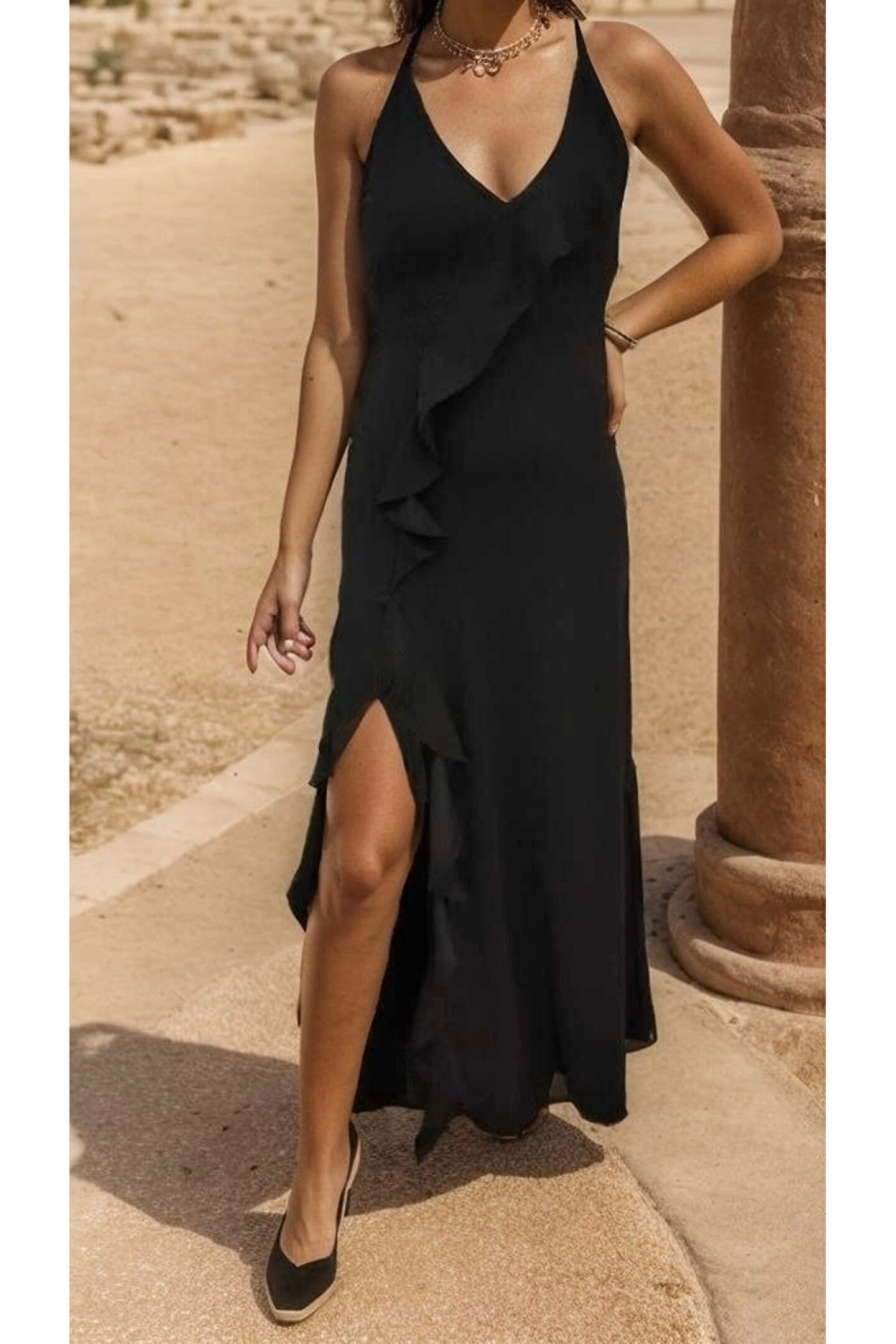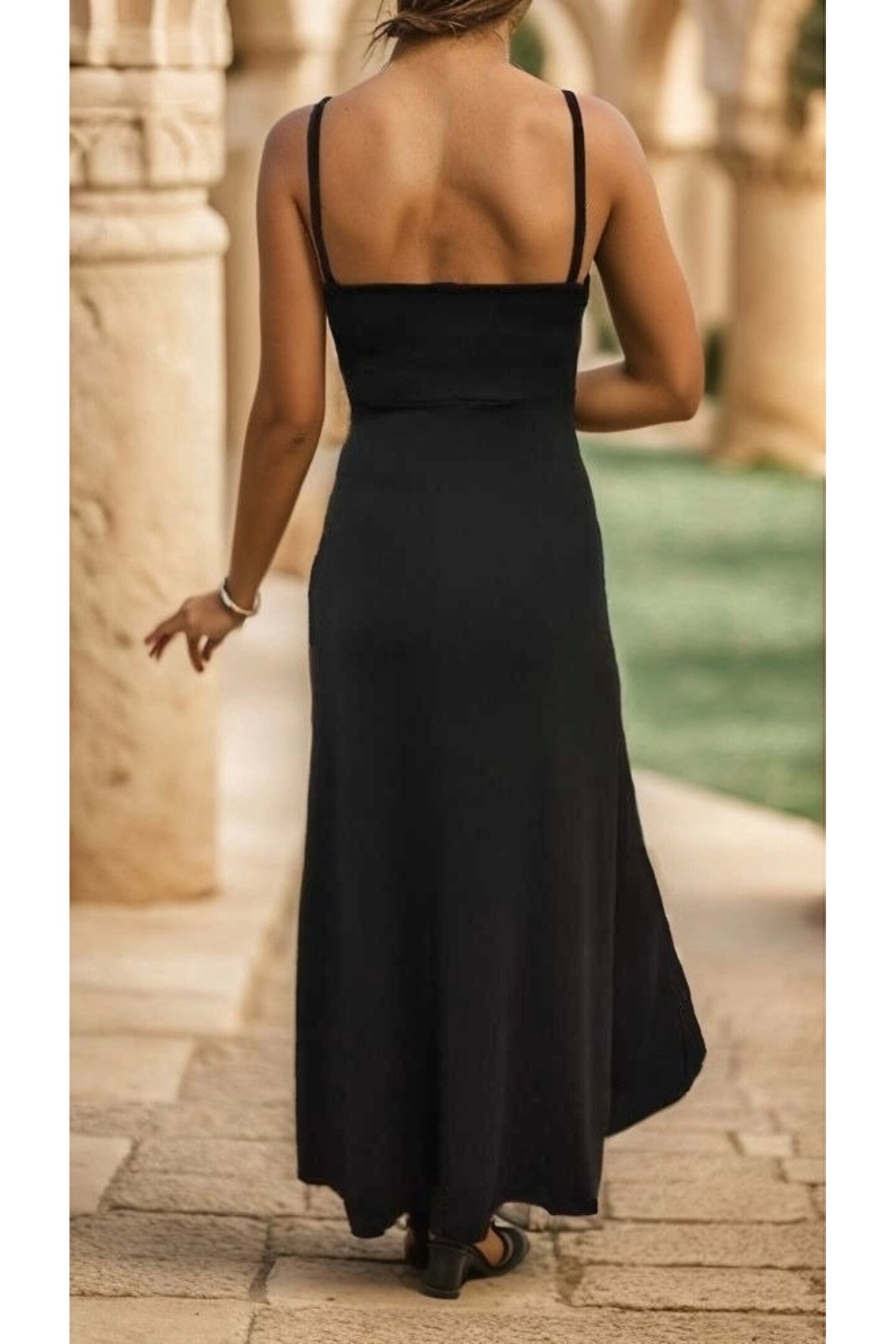 Kadın Ip Askılı Dekolteli Yırtmaç Detay Krep Elbise