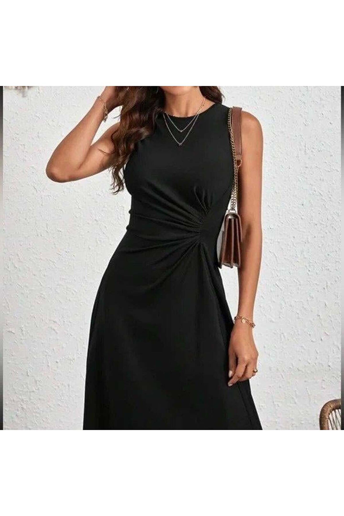 Kadın Sıfır Kollu Bisiklet Yaka Büzgülü Asimetrik Kesim Detaylı Janjan Krep Elbise