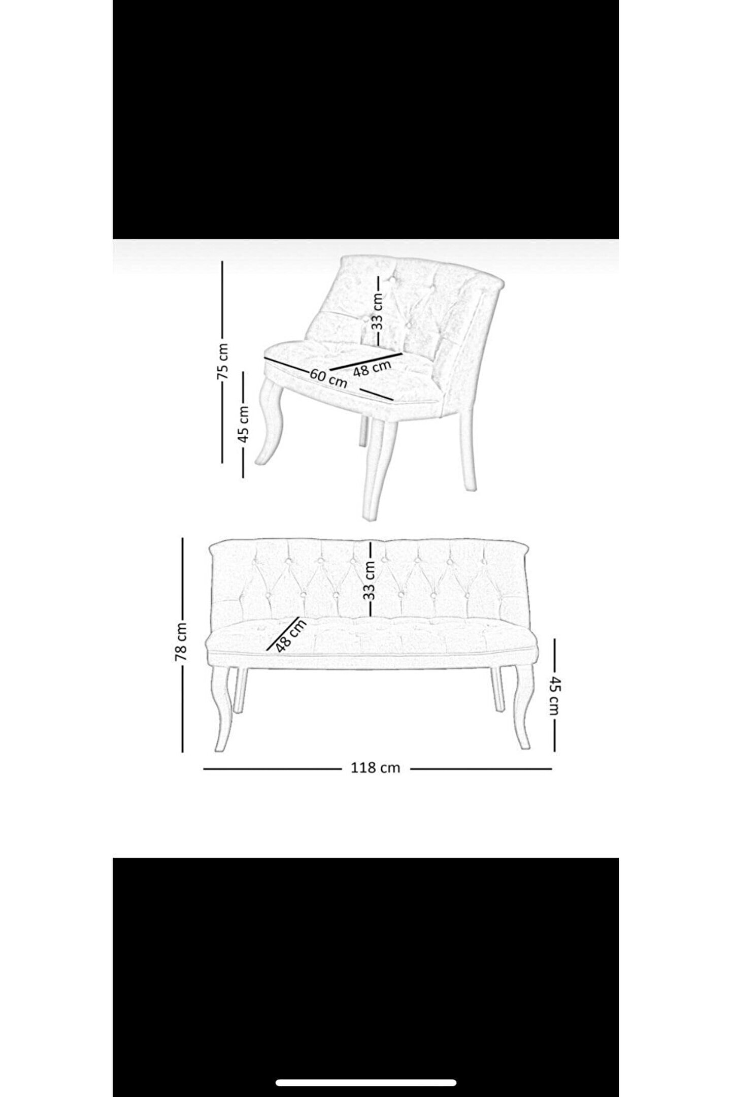 2 adet ikili koltuk, 2 adet tekli koltuk kullanılarak tasarlanan set oldukça şık bir görünüme sahiptir.; İkili koltuk 118 CM genişlik, 45 CM oturum derinliği, 33 CM sırt yüksekliği ile tasarlanmıştır. Aynı zamanda ikili koltuk 78 CM yükseklik, 45 CM ayak yüksekliği ile sunulur.; Ayakları yerden yüksek olduğu için alt kısmını temizleyebilmeniz kolaylaşır.; Tekli koltuk 45 CM ayak yüksekliği, 75 CM yükseklik 60 CM oturum genişliği, 48 CM oturum derinliği, 33 CM sırt yaslama uzunluğu ile üretilir. ; Koltuklar 33 CM sırt yaslama uzunluğuna sahip olduğu için sırtınızda konforlu bir destek ortaya çıkarır.; Koltukların ön sırt kısmında kapitone işlemi yapılmıştır. Bu sayede daha şık görünür.; Paslanmaz gold metal materyalden üretilen ayakları mevcuttur. Metal ayakları sağlam yapısı ile yüksek ağırlıkları kolaylıkla taşır.; Kırılma, eğilme, bükülme gibi durumlara karşı korunaklı yapıdadır. ; Ayaklarının uç kısmında çizilmeyi ve ses çıkarmayı engelleyen plastik pabuçlar bulunur. Bu pabuçlar sayesinde kullanıldığı alanda kayma yapmaz.; Oturum kısmında ve sırt kısmında yüksek yoğunlukta süngerler kullanılmıştır. Bu nedenle oturum yumuşaklığını ön planda tutar.; Kaliteli kumaşı sayesinde nemli bir bez kullanıp rahatlıkla temizleyebilirsiniz.; Kimyasal maddeler ile temas ettirilmemesi oldukça önemlidir. Böylelikle canlı rengini koruyabilmesi mümkün olur.; Temizlik sırasında tüylenme yırtılma, çizilme gibi olumsuz durumlar engellenir.;
