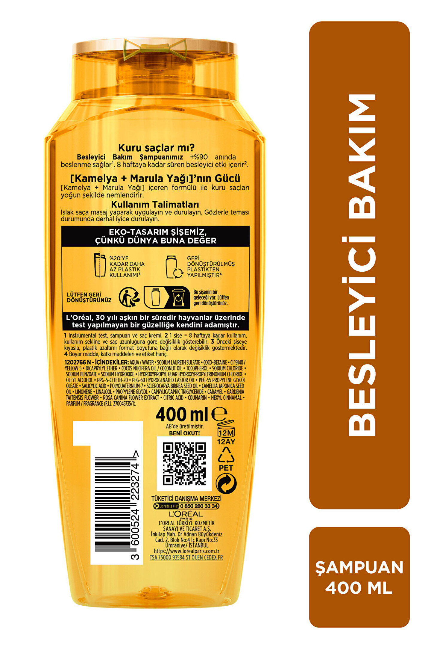 Yeterince beslenmeyen saçlar parlaklığını yitirir, sert ve mat bir görünüm alır.; Elseve Mucizevi Yağ Besleyici Bakım Şampuanı, Kamelya ve Marula Yağı ile zenginleştirilmiş formülüyle; ; 1. +%90 anında beslenme sağlar, 8 haftaya kadar süren besleyici etki içerir.;2. Kuru saçları yoğun şekilde nemlendirir.; 3. Göz alıcı parlaklık sağlar.;4. İpeksi yumuşaklık verir ve canlı görünüm kazandırır.