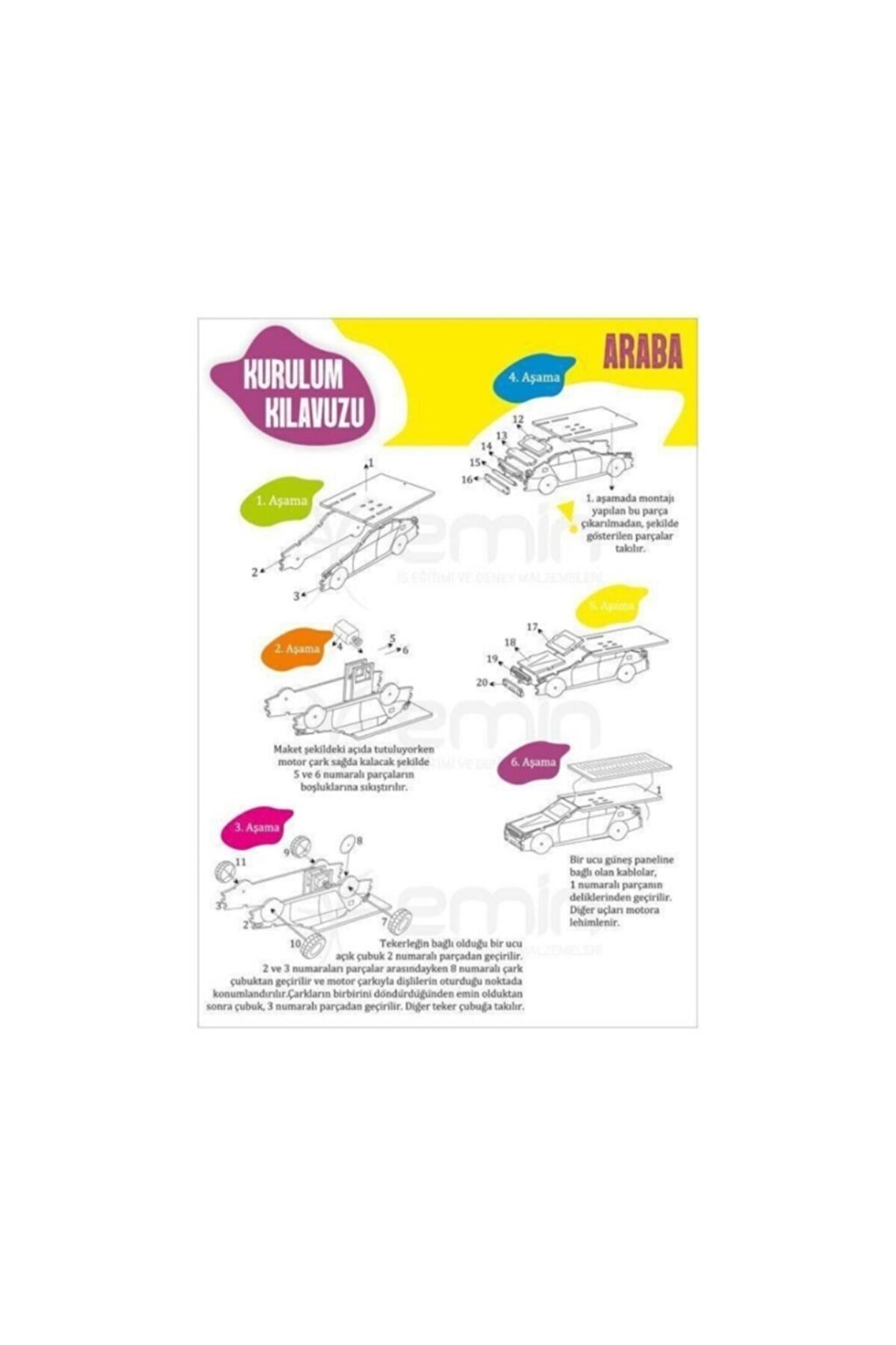 Güneş Enerjili Araba Yapım Seti - Deney Seti Solar Enerji Araba Car Kit Güneş enerjisi ile çalışan Araba seti. 6 yaş üzeri çocuklara elektroniği sevdirmek ve yenilenebilir enerji kaynaklarını öğretmek için mükemmel bir üründür. Demonte olarak gönderilen ürünün kurulumu oldukça kolaydır ve kurulum kılavuzu ürünle birlikte gönderilmektedir. Bu Eğitim Kiti: Çözüm üretme ve analiz etme ; Üreticilik ; El-Göz Koordinasyonu ; Konsantrasyon gelişimi ; İnce motor becerilerinin gelişimi ; Yenilenebilir Enerji ile tanışma özelliklerini kullanıcılarına kazandırır. ; Ürün İçeriği: Güneş Paneli ; Dc Motor ; 4 ad. Tekerlek ; 2 ad. Çark ; 13 ad. 3mm MDF ; Kurulum Kılavuzu ;