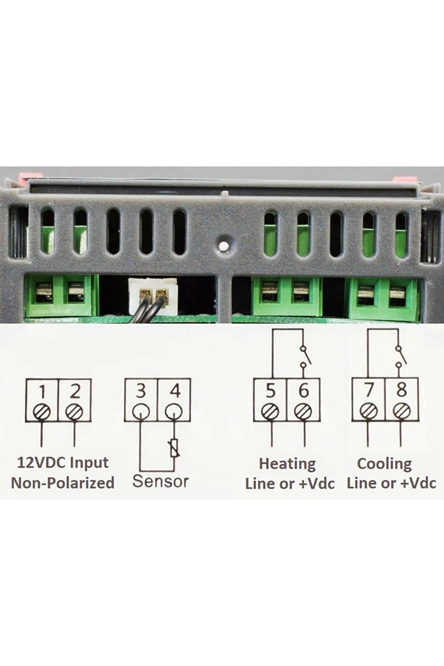 ⚠️ Önemli Kurulum Notu: Cihazın beslemesi 12V DC ile yapılır. Ancak ısıtma ve soğutma röle çıkışları "kuru kontak" (anahtar) mantığıyla çalışır. Yani fanı veya ısıtıcıyı çalıştırmak için röle girişine ayrıca güç vermeniz gerekir (Şemada gösterildiği gibi). Röleler voltaj üretmez, devreyi tamamlar.