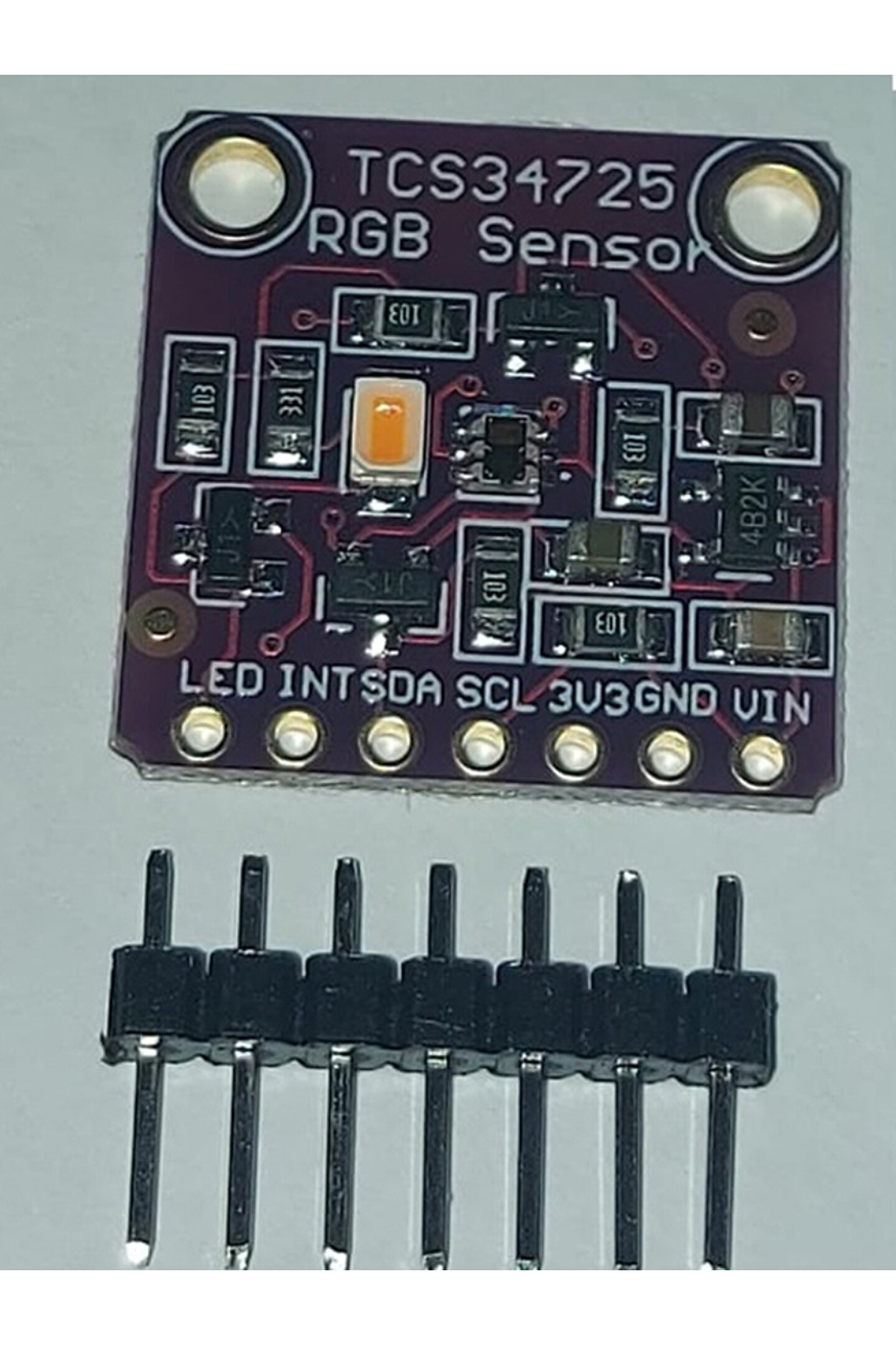 TCS34725 Renk Sensör Modülü Color Sensor RGB Recognition TCS3472 devices available in red, green and blue (RGB) and digital Mingguang induction return value. ; Color sensitive photodiode integrated sheet cutting and localized infrared light blocking filter, minimizing the infrared spectral components of the incident light, so that more accurate color management. ; High sensitivity, wide dynamic range and an infrared light blocking filter makes TCS3472 become ideal lighting conditions change and through color sensitive element attenuating materials under conditions of solution. ; Specification: Red, Green, Blue (RGB), and White Light Sensing with IR Blocking Filter Programmable Analog Gain and Integration Time 3,800,000:1 Dynamic Range Working voltage: 3.3~5V Detection distance: 3 ~ 10mm Communication method: IIC Very High Sensitivity : Ideally Suited for Operation Behind Dark Glass Maskable Interrupt Programmable Upper and Lower Thresholds with Persistence Filter Power Management Low Power : 2.5-uA Sleep State 65-uA Wait State with Programmable Wait State Time from 2.4 ms to > 7 Seconds I2C Fast Mode Compatible Interface Data Rates up to 400 kbit/s Input Voltage Levels Compatible with VDD or 1.8 V Bus Register Set and Pin Compatible with the TCS3x71 Series Small 2 mm*2.4 mm Dual Flat No-Lead (FN) Product Pin Definitions: VIN power supply positive GND power supply negative 3V3 3.3V output SCL clock signal SDA data signal INT interrupt output, active low The LED controls the LED light near the sensor. ; When the high level signal is on or off, the LED light is on, and the low level signal LED is off. ; Paket İçeriği : 1 Adet TCS34725 Renk Sensör Modülü;