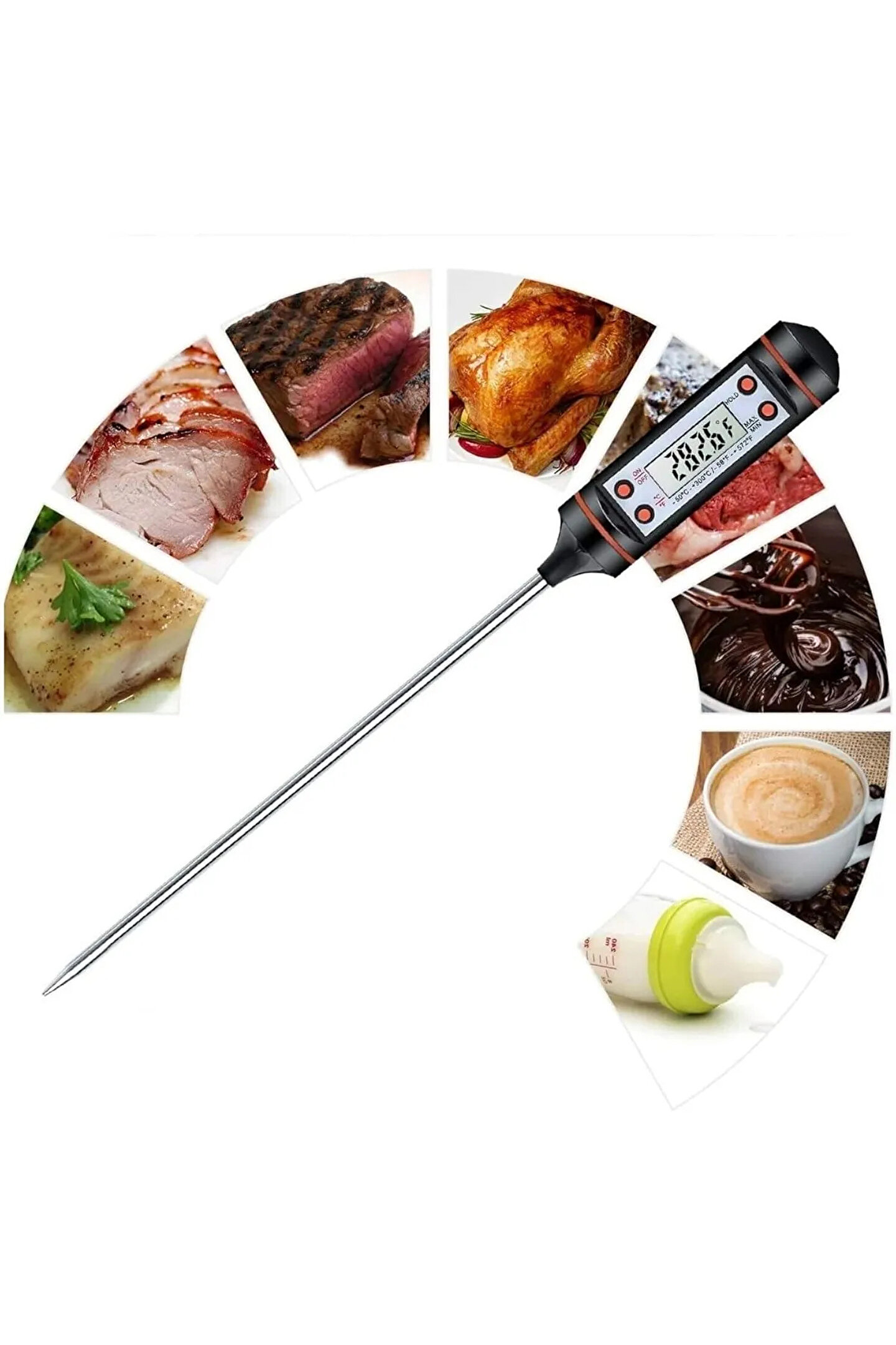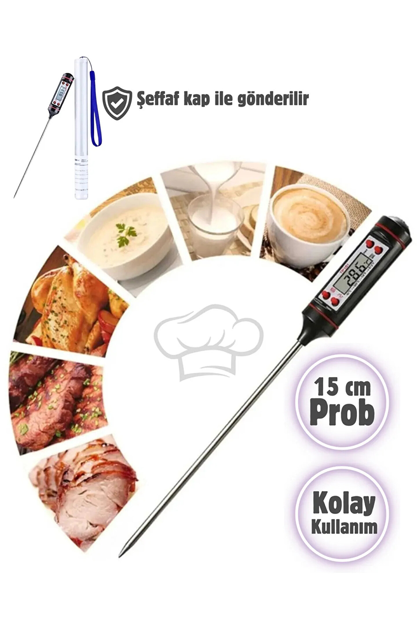 • Et Termometre Yemek Sıcaklık ÖlçerYEMEK TERMOMETRE ÖLÇER Özellikle tarifi hassas olan özel yemekler için vazgeçilmez bir üründür. Bebek maması ve yoğurt gibi belli sıcaklıklarda pişmesi gereken yiyeceklerin sıcaklıklarını ölçmek için kullanılır. Ayrıca dondurulmuş gıdaların elli sıcaklığa gelene kadar ısınmasının takibi içinde kullanabilirsiniz. Ürün Özellikleri Paslanmaz çelik sensör Sıcaklık ölçüm aralığı ( -50 °C ile 300 °C ) Santigrad ve Fahrenight olarak ölçme imkanı Kullanılmadığı durumlarda otomatik kapanma Sensör hata gösterimi Önceki ölçüm hafızası Hassasiyet 0,1°C Paket İçeriği 1 Adet Yemek Termometre Ölçer