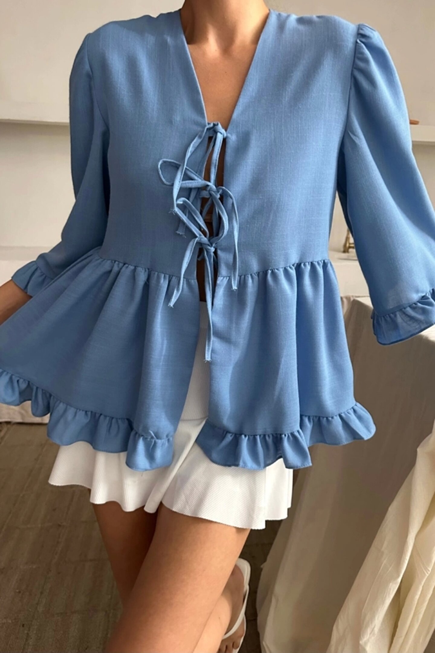KETEN BLUZ ÖNDEN BAĞLAMALI FIRFIR DETAYLI - Mavi