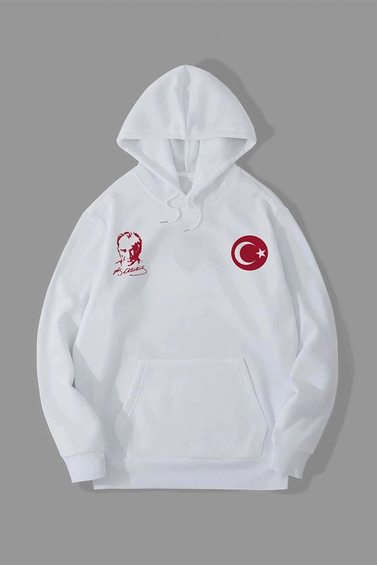 Emu Wear 10 Kasıma Özel Üç İplik Kapüşonlu Baskılı SweatShirt - Beyaz