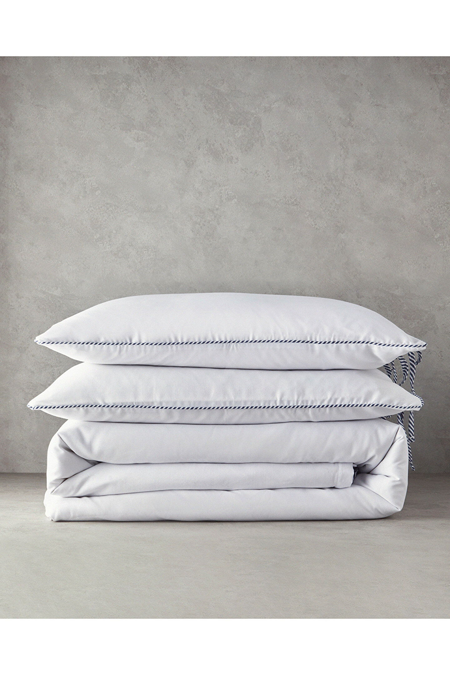 Rahatlatıcı bir uyku deneyimi sunan çift kişilik nevresim takımı, beyaz ve lacivert renkleriyle şık bir görünüm sağlar.; Lastikli çarşaf tasarımı, yatağınızın üzerine mükemmel uyum sağlayarak sabit kalmasını ve kaymayı önler.; Düz deseniyle sadelikten yana olanların tercihi olup, her yatak odasına kolayca uyum sağlar.;