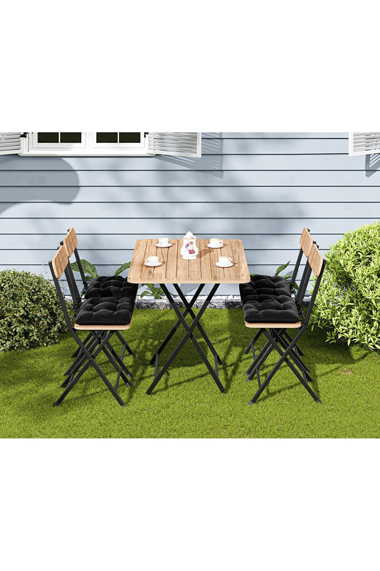 4 kişilik geniş oturma kapasitesiyle, balkon ve bistro set olarak tasarlanmış bu takım, aile yemekleri veya arkadaş toplantıları için idealdir; Dayanıklı çam malzemesi sayesinde uzun ömürlü kullanım sunar ve dış mekan koşullarına karşı yüksek direnç gösterir; Modern ve şık tasarımıyla dikkat çeken bu takım, bahçe dekorasyonunuza estetik bir dokunuş katar; Kolay temizlenebilir yüzeyi ile pratik kullanım sağlar; böylece yemek sonrası temizliği hızlı ve zahmetsizdir;