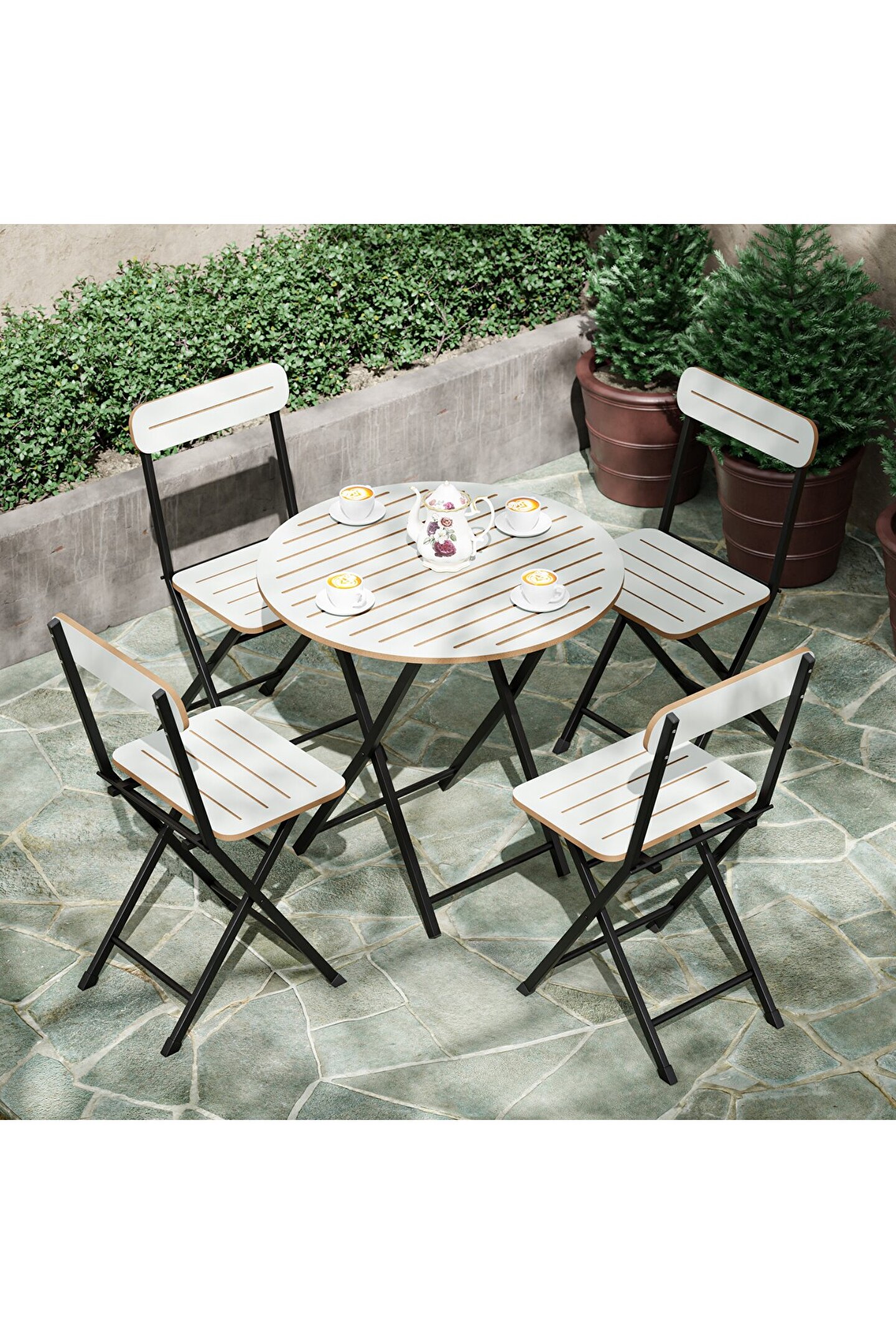 4 Kişilik Yuvarlak Bistro Takım Bahçe Mutfak Masa Sandalye Beyaz dört sandalye ve bir masadan oluşmakta olup, hem estetik açıdan hoş bir görünüm sunar hem de fonksiyonel bir kullanım sağlar. Bu set bahçeler, teraslar ve balkonlar için mükemmel bir seçimdir.