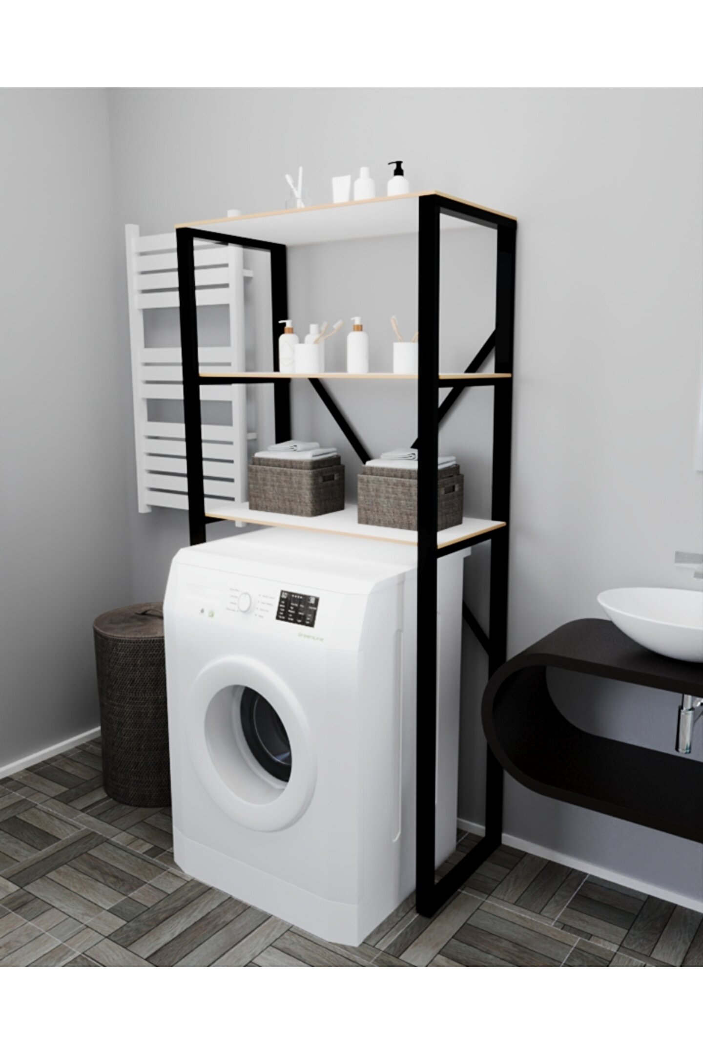 Bu ürün, banyolarınızda yerden tasarruf sağlar ve çamaşır makinesi üzerindeki kullanılmayan dikey alanı en verimli şekilde değerlendirir. Estetik tasarımı sayesinde banyonuzda şıklık ve düzen sunar. Rafların geniş depolama alanı, temizlik malzemeleri, havlular ve diğer banyo eşyalarınızı düzenli bir şekilde yerleştirmenize imkan tanır.