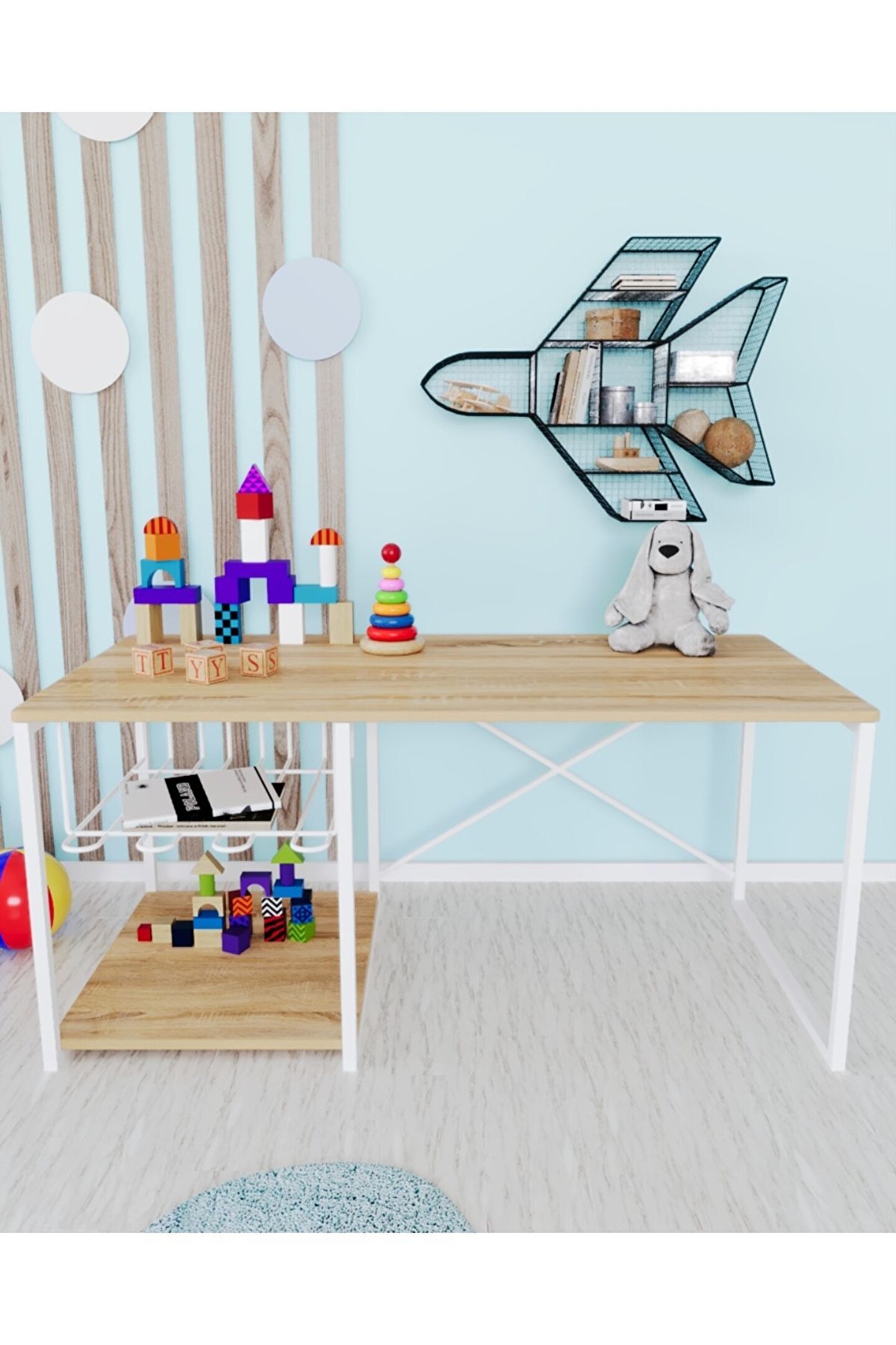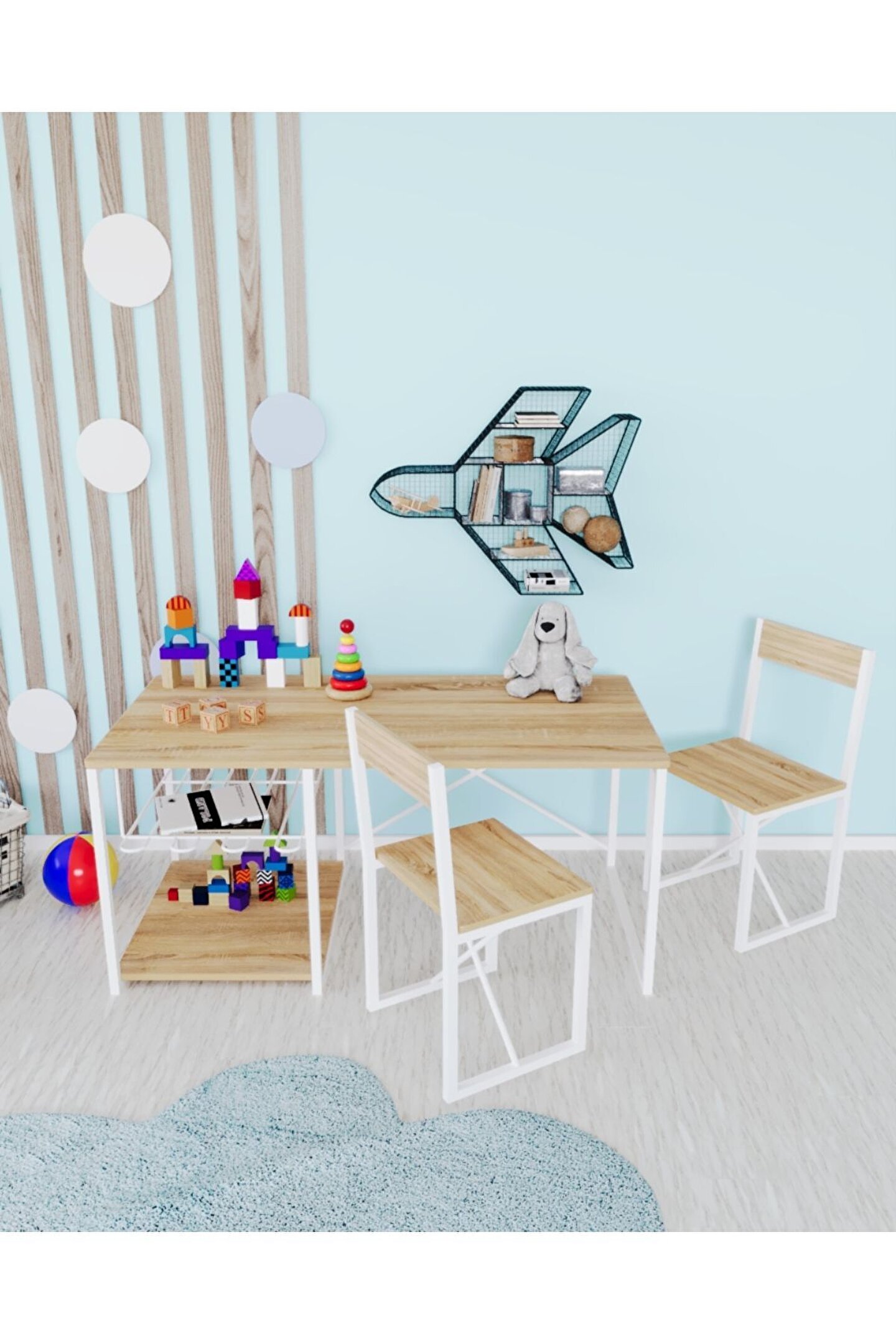 Çocuk Çalışma Masası Ve Sandalyesi Oyun Etkinlik Aktivite Masası Çocuklarınız ile birlikte çalışma yapabileceğiniz masa ve sandalye takımı. ; Malzeme: 12 mm 1. Kalite MDF ve 15*15 metal profil ayaklar. ; Paket içeriği: 1 adet masa 2 Adet sandalye, 1 adet tel raf. ; Masa ölçüleri: yükseklik: 40 cm, uzunluk: 90 cm, genişlik: 45 cm Sandalye ölçüleri: oturma alanı yüksekliği 28 cm, uzunluk 27 cm, genişlik: 24 cm, yerden sırt yüksekliği 50 cm .MDF yapısı, metal ayaklar sayesinde uzun yıllar kullanım sağlar. ; Ayakların altında bulunan plastik pabuçlar sayesinde zemine zarar vermez. ;