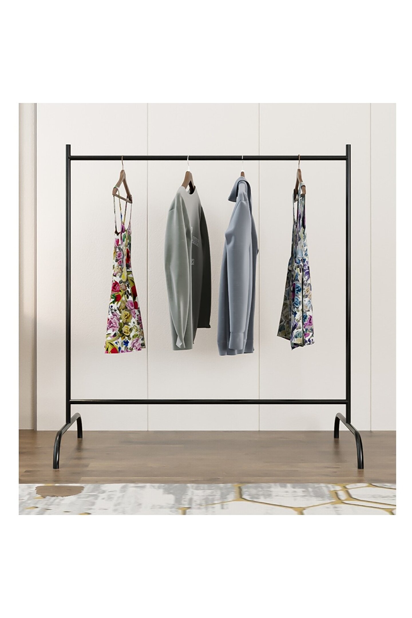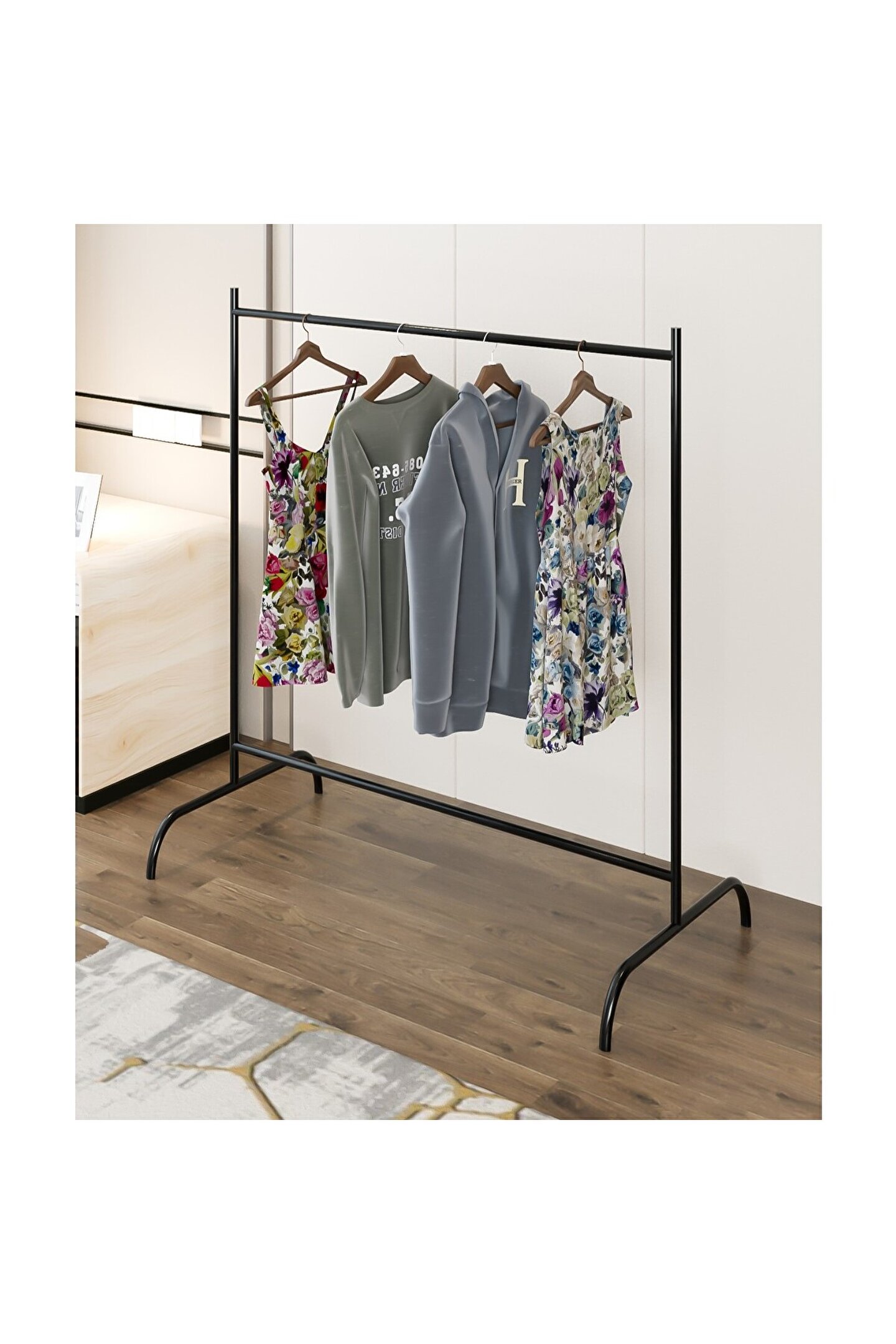 Konfeksiyon Askısı Ayaklı Askılık Elbise Askılığı Siyah, giysilerinizi düzenli ve erişilebilir bir şekilde saklamanızı sağlayan pratik bir ev mobilyasıdır. Bu ürün, ev veya ofis ortamında kullanılan klasik askılıklardan farklı olarak, modern ve minimalistik bir tasarıma sahiptir. Elbiselerinizi düzgün bir şekilde asmanızı sağlayarak, dolaplarınızda yer açmanıza yardımcı olur ve aynı zamanda giysilerinizi kırışmadan muhafaza eder. Çizilmeye karşı dayanıklı elektrostatik toz boya ile kaplanmış olan masif profil borudan üretilmiştir. Bu, ürünün hem estetik hem de dayanıklı olmasını sağlar.