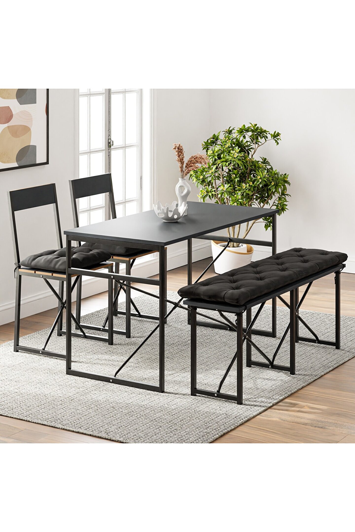 Mutfak Masası Bench Bank , zarif ve sade bir mobilya setidir. Bu set, gerek alan tasarrufu sağlayan akıllı tasarımıyla gerekse estetik açıdan sunduğu sadelikle öne çıkar. İki sandalye ve bir bench'ten oluşan bu set, mekanınıza modern bir hava katmak için ideal bir seçenektir.