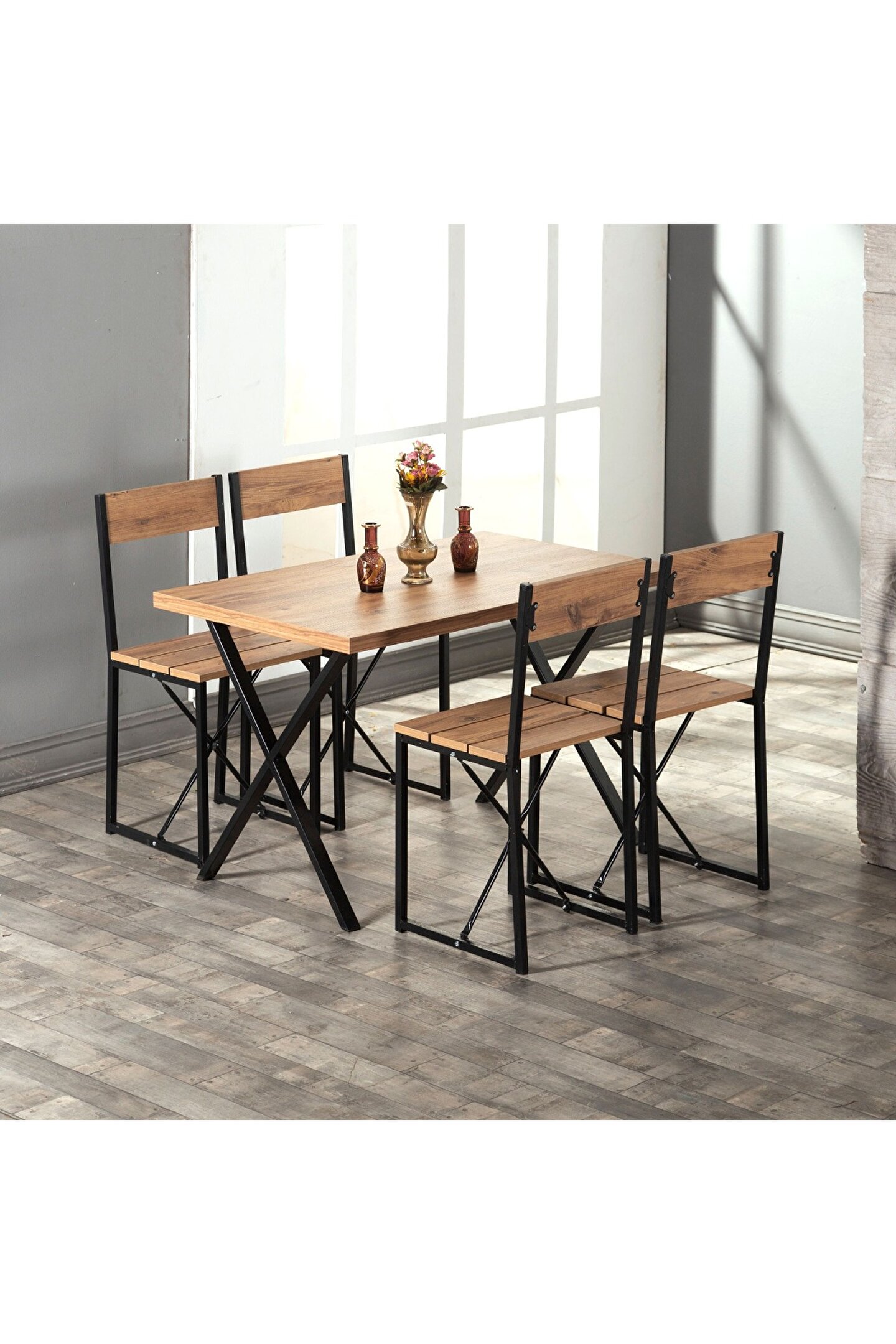 Mutfak masası + 4 adet sandalye seti: X metal ayak dekoratif ve sağlam yapıdadır. ; Masa ebatları: Genişlik: 110 cm Derinlik: 70 cm Yükseklik: 70 cm Sandalye bilgileri: Metal profil güçlü ve sağlam yapıdadır. ; 110 kg kaldırma kapasitesi 18 mm Sunta lam tabla Sandalye ebatları: Oturma alanı yükseklik: 47 cm Sırt yükseklik: 85 cm Oturma genişlik: 40 cm Ürün demonte gelmektedir, kutu içinde bulunan vidalarla ayağı tablaya monte ederek kullanabilirsiniz.;