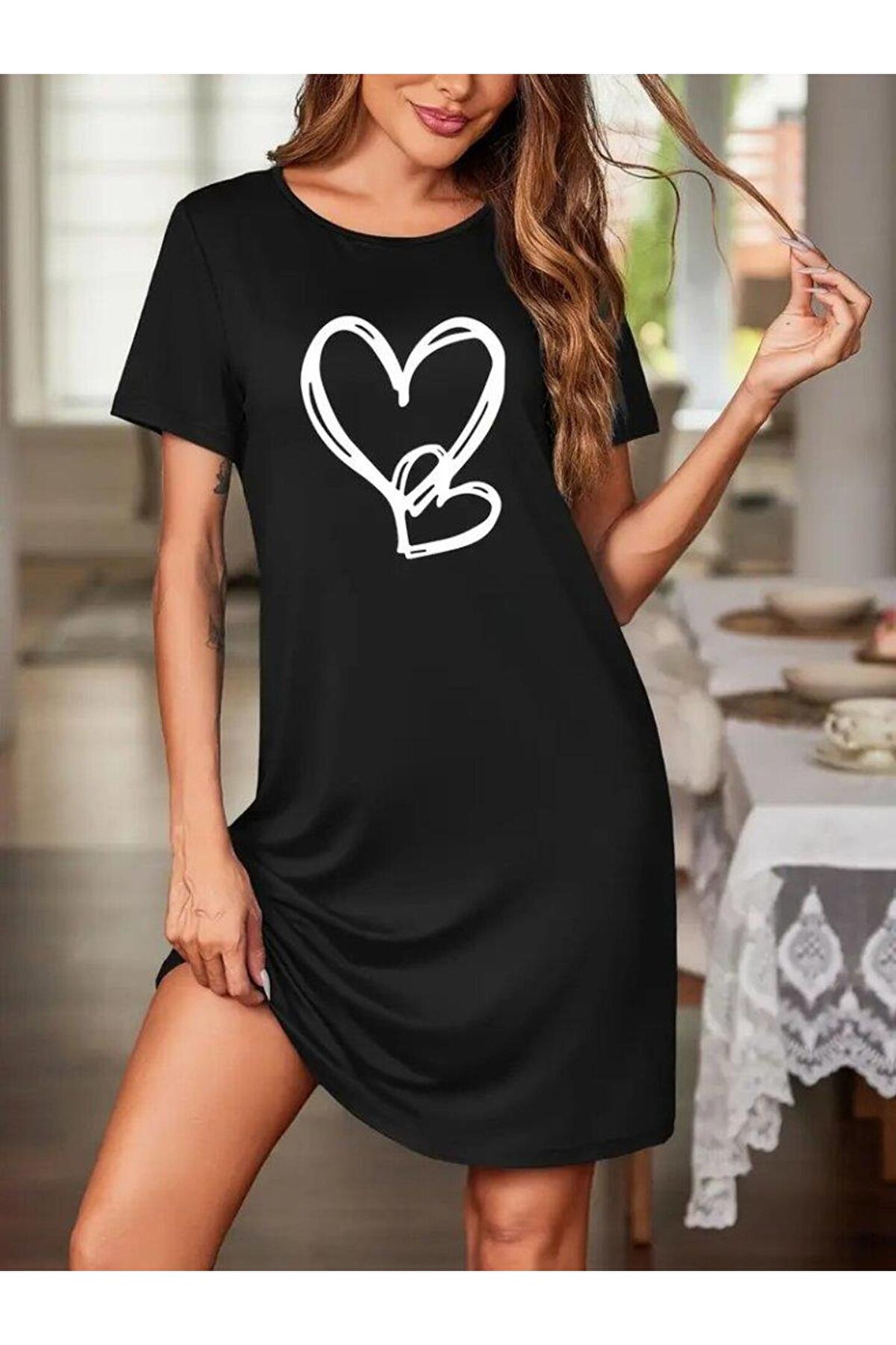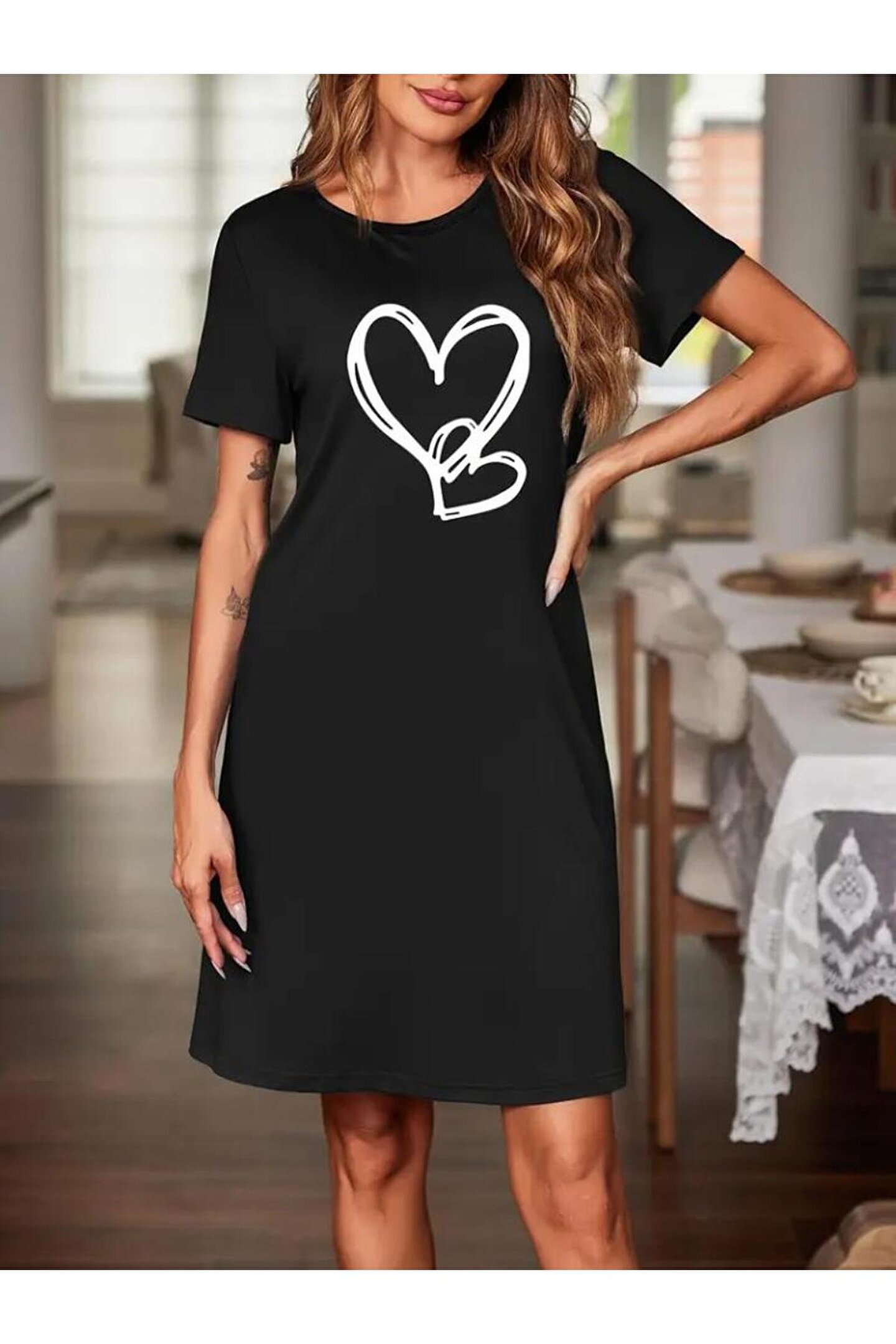 EPSWorld Kadın Kısa Kollu Bisiklet Yaka Kalp Desenli Viskon Elbise