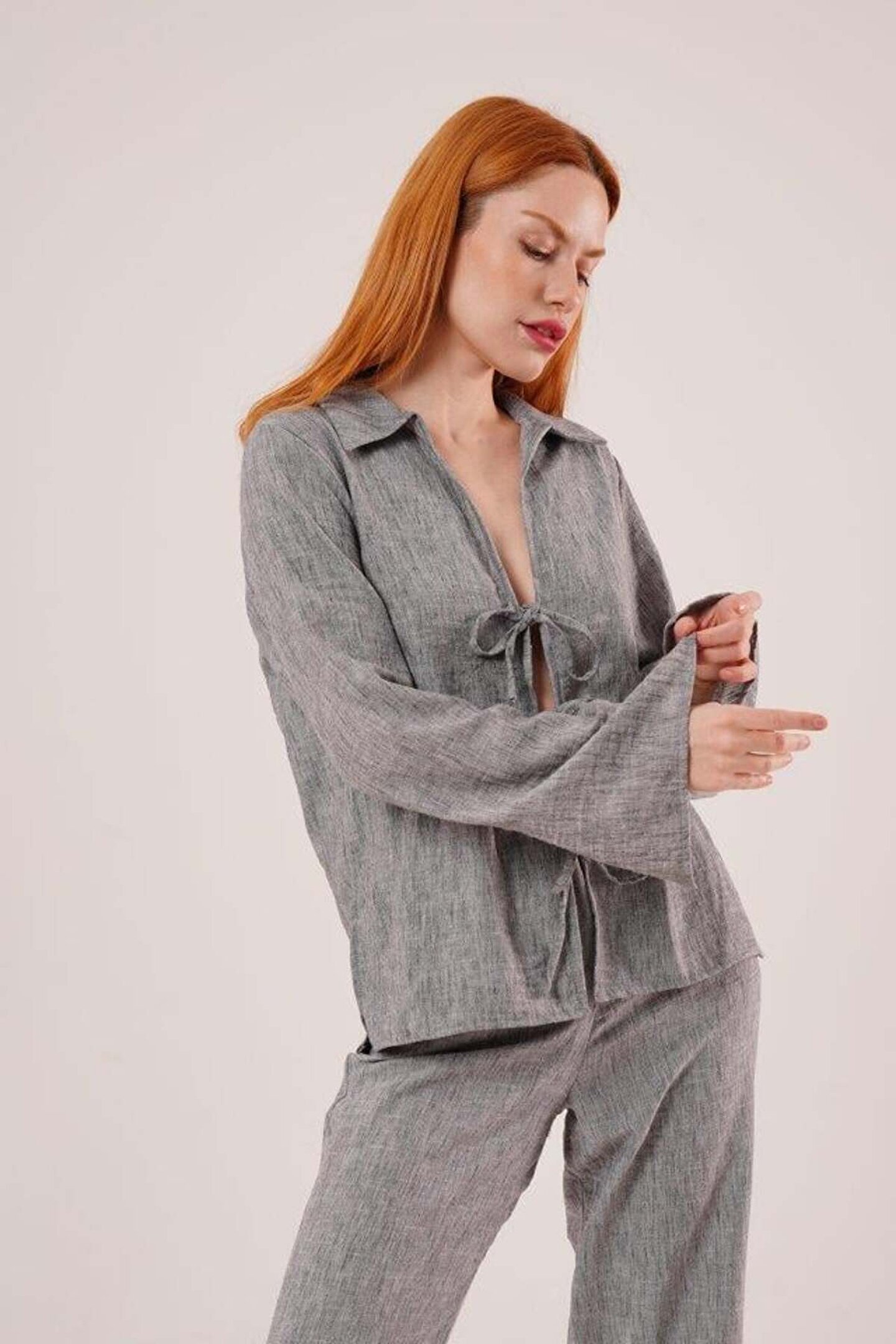 Ön Bağlama Detaylı Pantolon Ve Gömlek Antrasit İkili Takım
