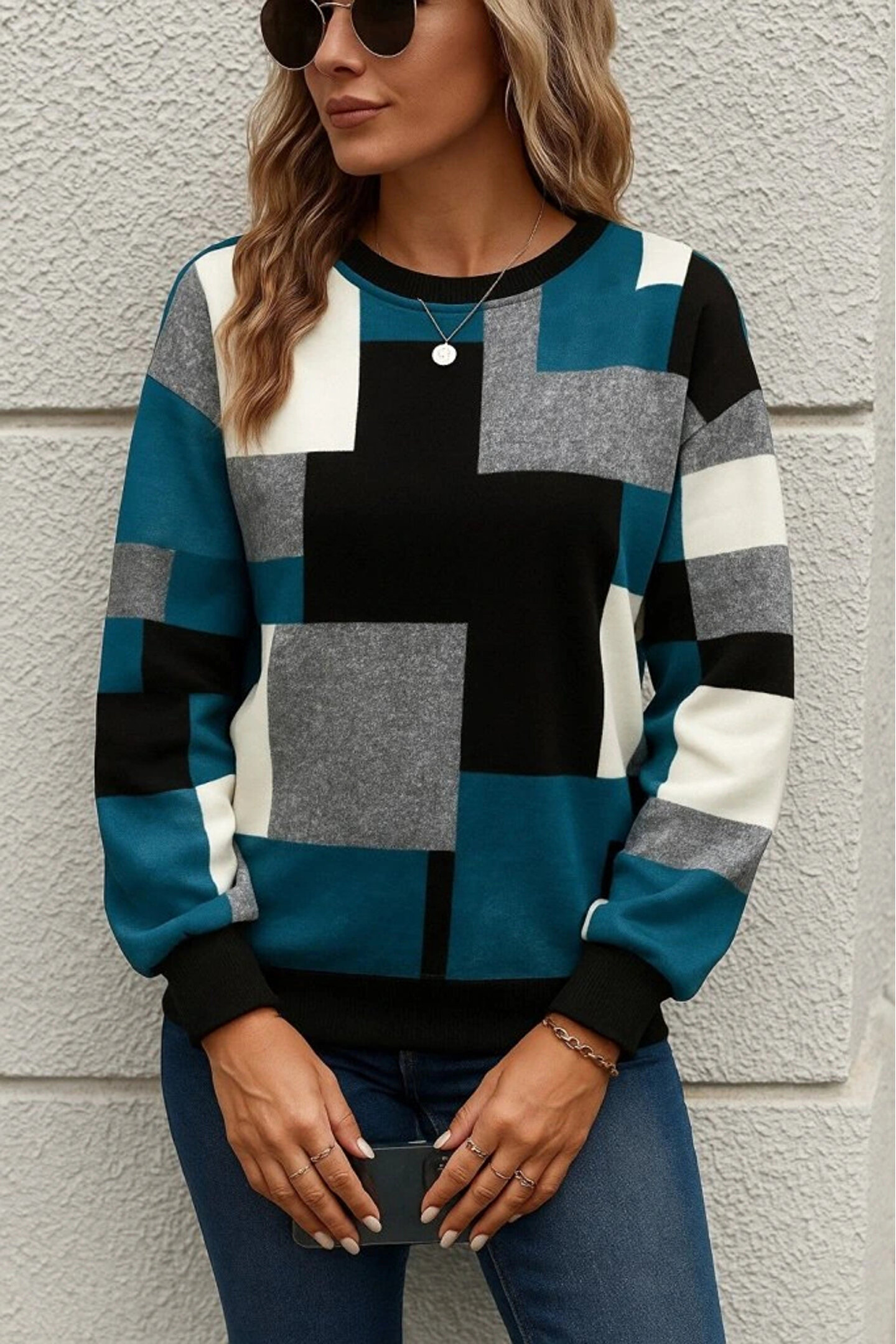 EQURİ Kadın Uzun Kollu Bisiklet Yaka Renkli Blok Baskı Dalgıç Bluz
