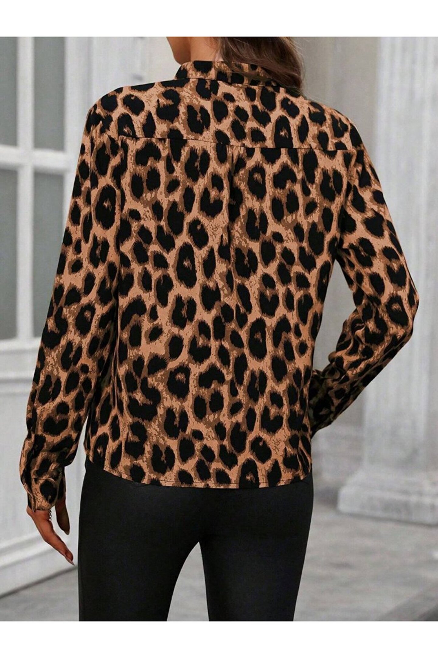 Kadın Uzun Kollu V Yakalı Leopar Desenli Modal Bluz