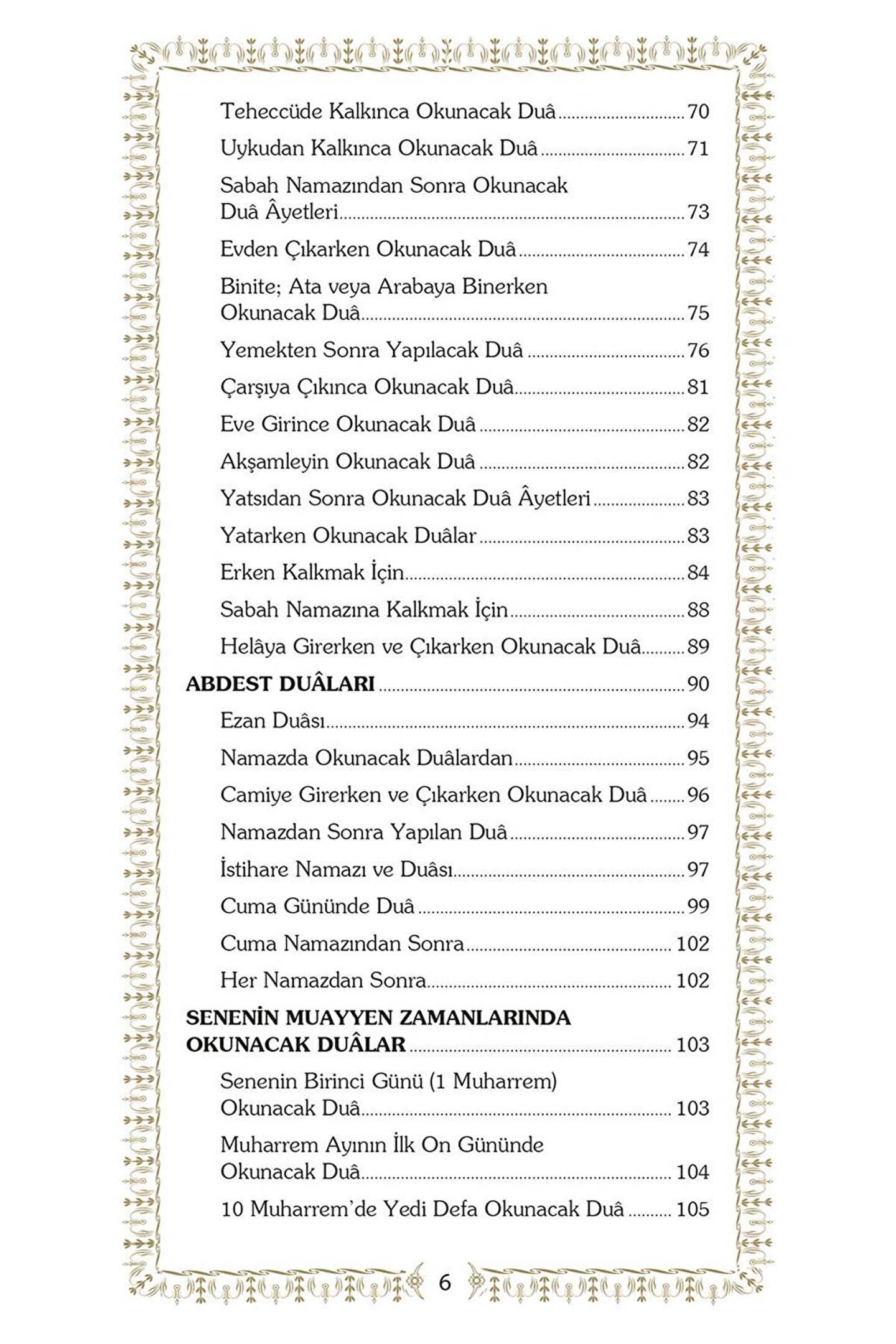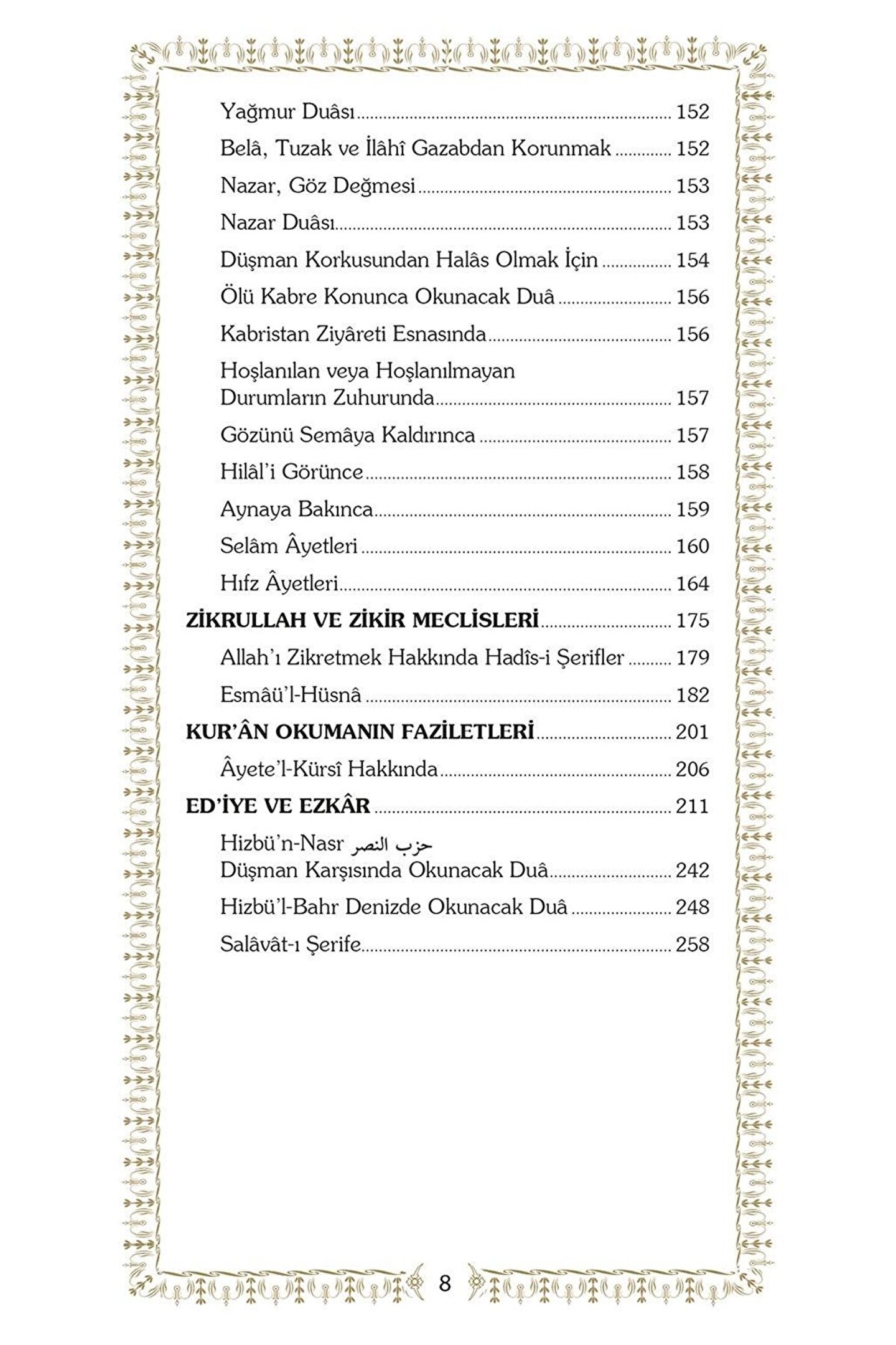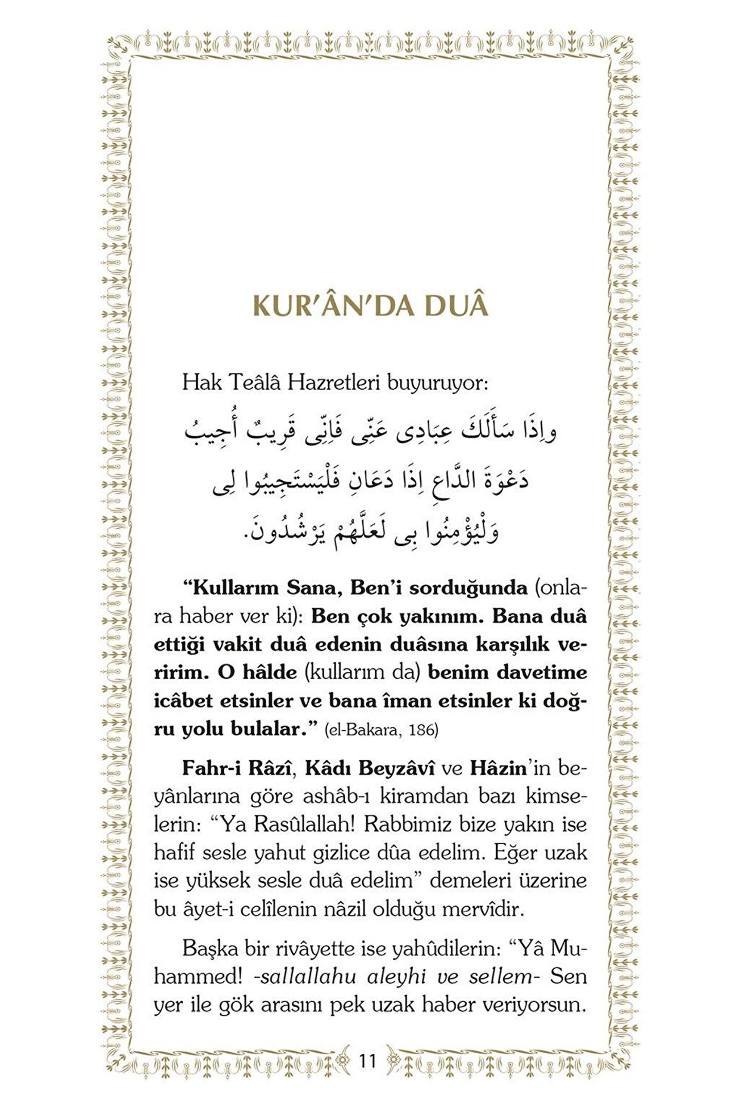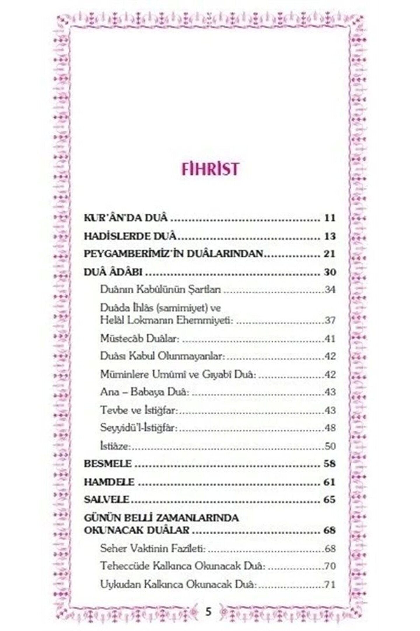Peygamberimizin hayâtı, yaşanan her ânı dualarla dokumanın mümkün ve hatta elzem olduğunu gösteren tarihi bir vesika olarak önümüzde durmakta.; O "dua ibâdetin özüdür” diye tenbih eder ümmetine.; Elinizdeki dualar demeti merhum müellifin sevenlerine tavsiyesi mahiyetindedir.; Abdest alırken dua, eve girerken dua, yola çıkarken dua.; Kandil gecelerinde dualar.; Bollukta dua, darlıkta dua.; Gündüzlerin meşakkati dualarla aşılacak, geceler zikirlerle aydınlanacak.