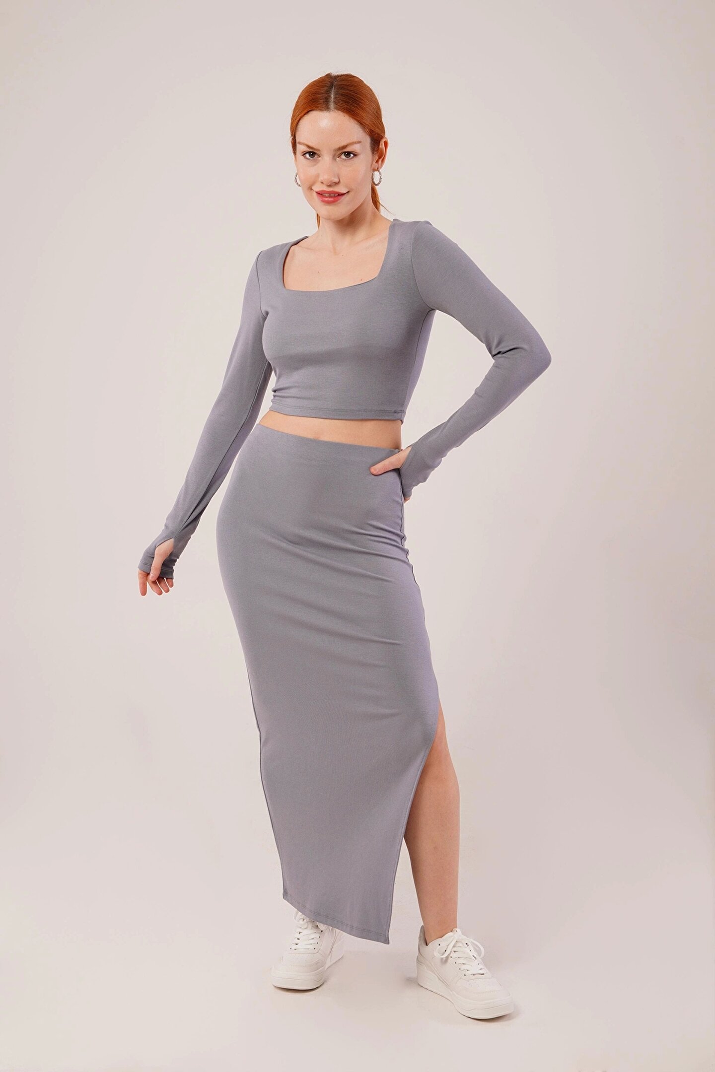 Kare Yaka Bluz Ve Yırtmaç Detaylı Etek İkili Gri Takım