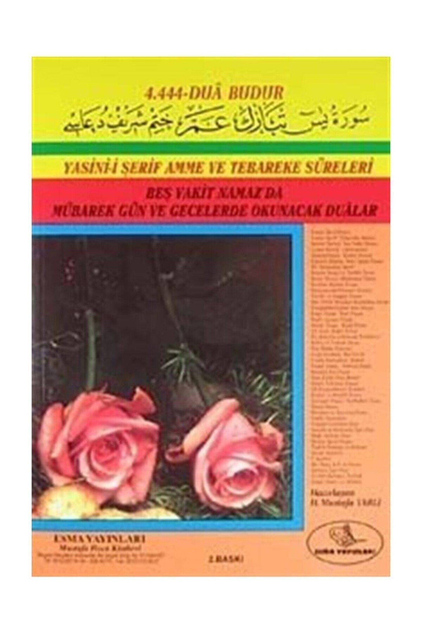 Yasin-i Şerif Amme ve Tebareke Süreleri Beş Vakit Namaz'da Mübarek Gün ve Gecelerde Okunacak Dualar (B.Boy 2.hm) (Kod: 001) Mustafa Varlı / Esma Yayınları Sayfa Sayısı: 160; Kağıt Türü: 3. Hm. Kağıt; Ebat: 16,5 x 23,5; Dil: Türkçe; Cilt Durumu: Karton Kapak; ISBN-10: 9756354087; Yazar: Mustafa Varlı;