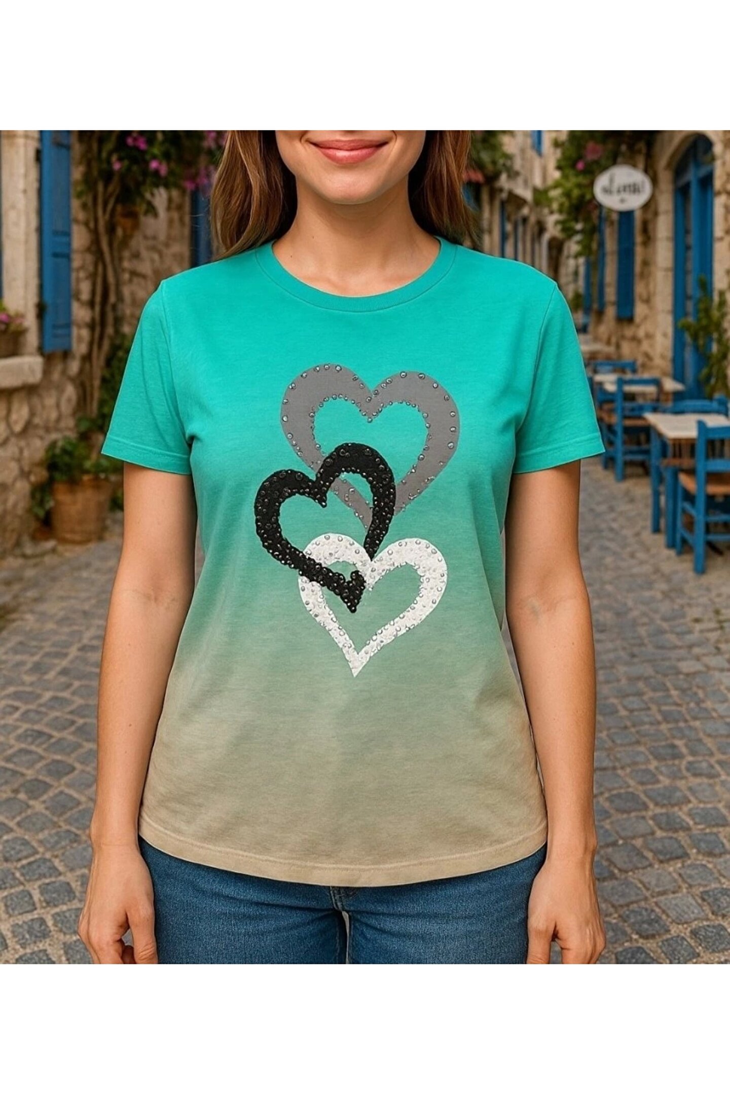 Kadın Kısa Kollu Bisiklet Yaka Kalp Baskılı Süprem Bluz