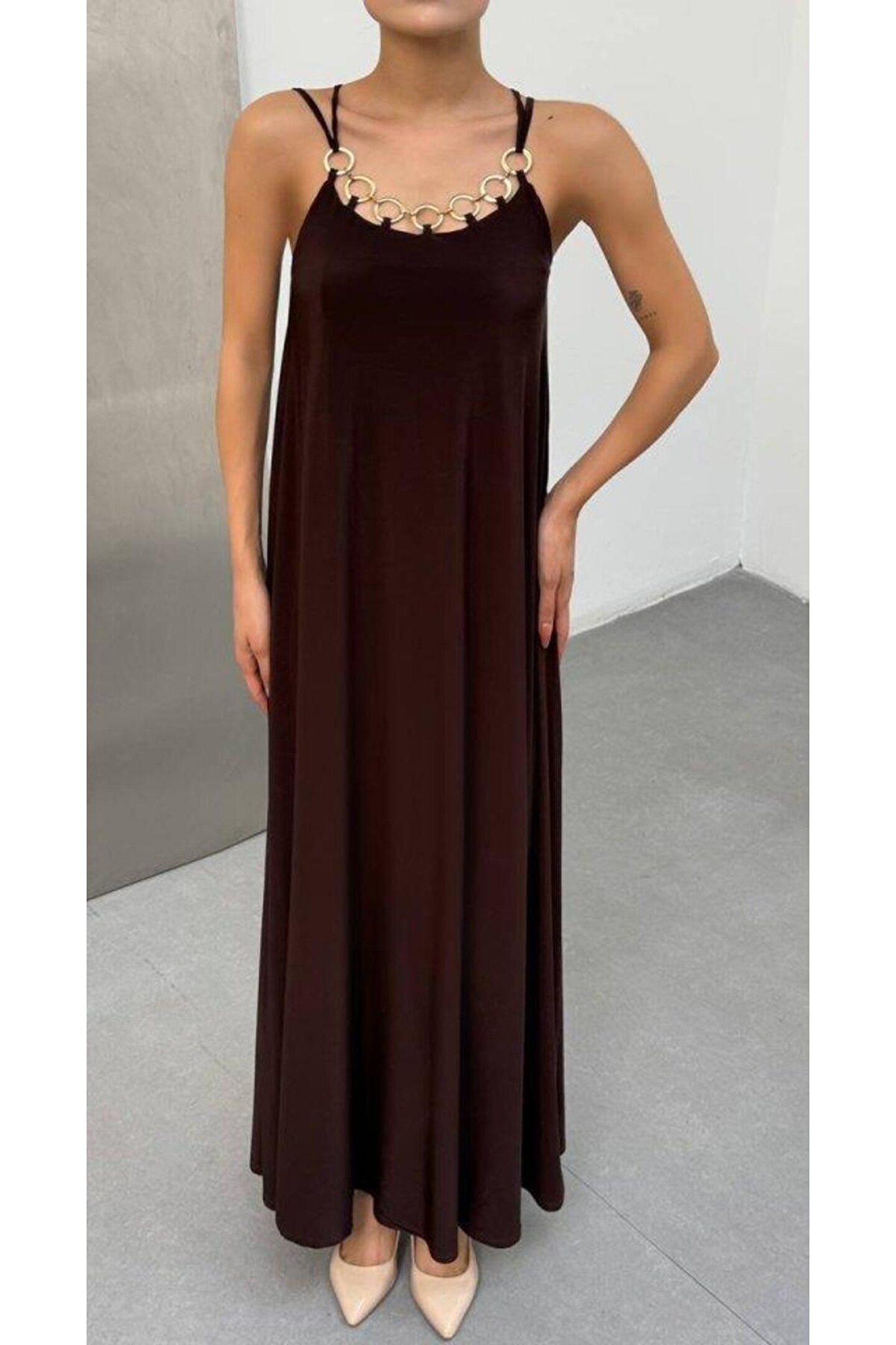 ESSE BUTİK Kadın Omuz Askılı Kuş Gözü Zincir Detay Sandy Kumaş Maxi Boy Elbise