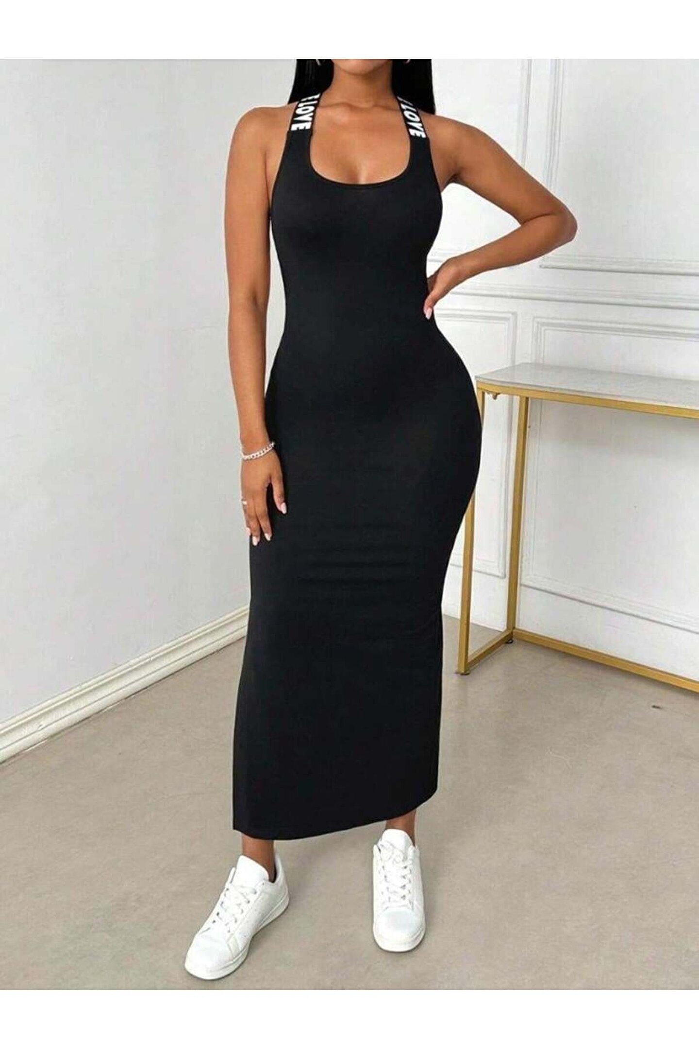 Kadın Yuvarlak Yaka Sırttan çapraz şerit Love Detaylı Yırtmaçlı Viskon Elbise