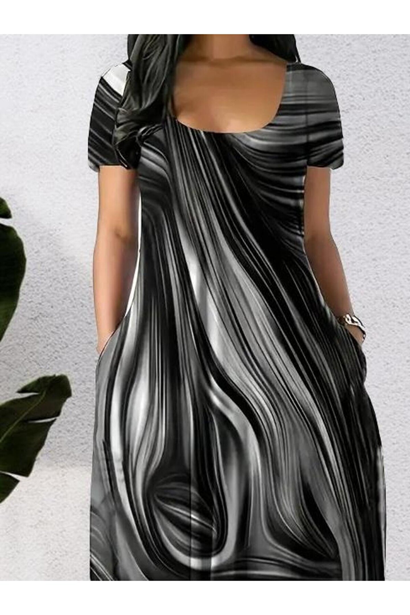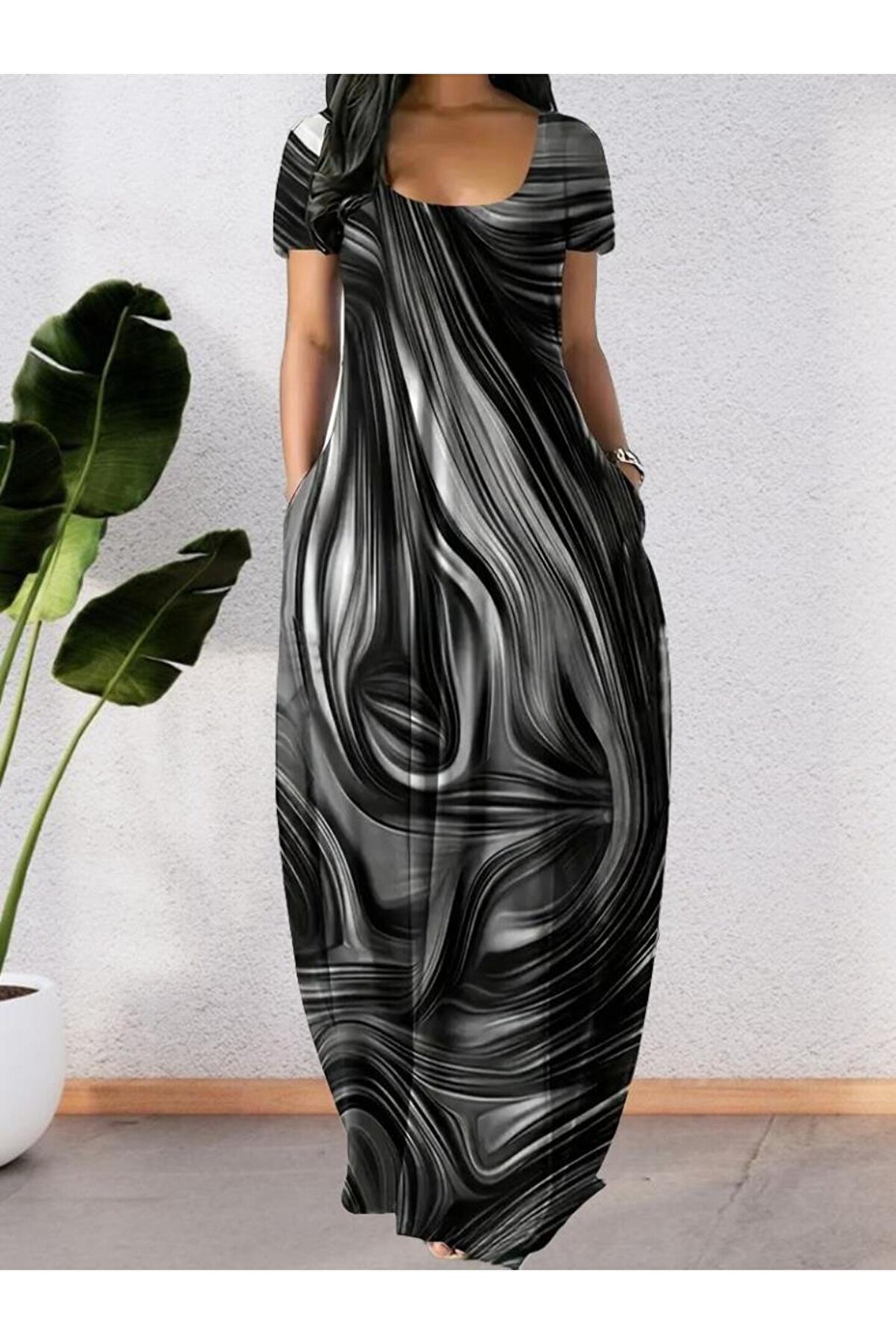 ESSFASIHON Kadın Kısa Kollu Yuvarlak Yaka Cepli Salaş Baskılı Süprem Elbise