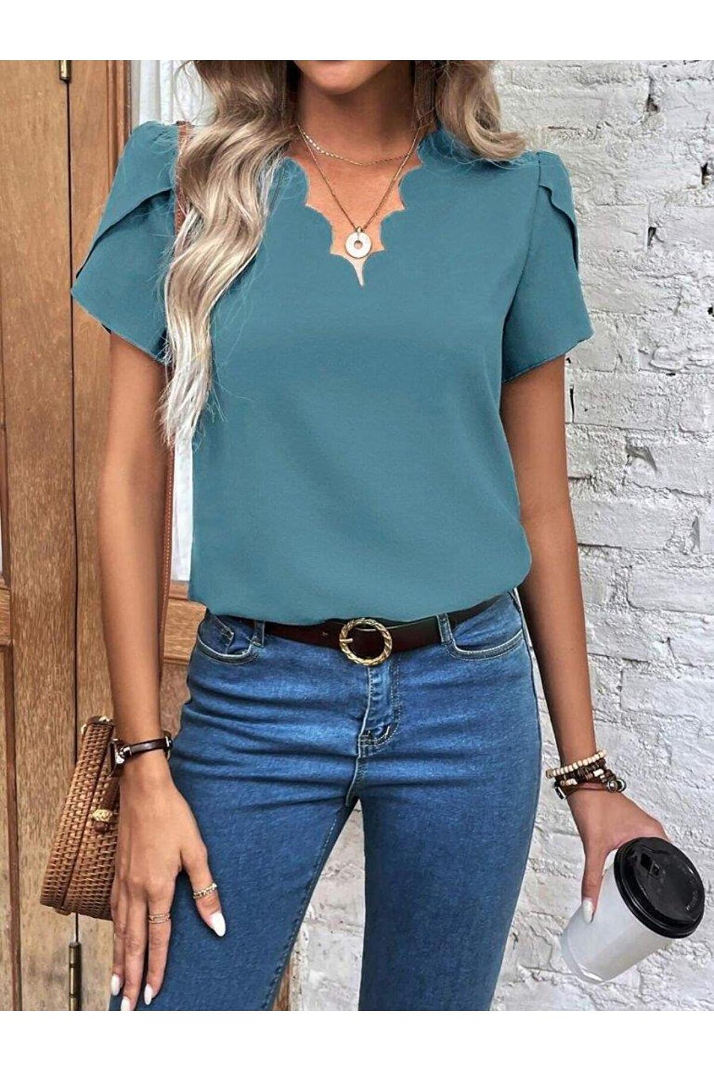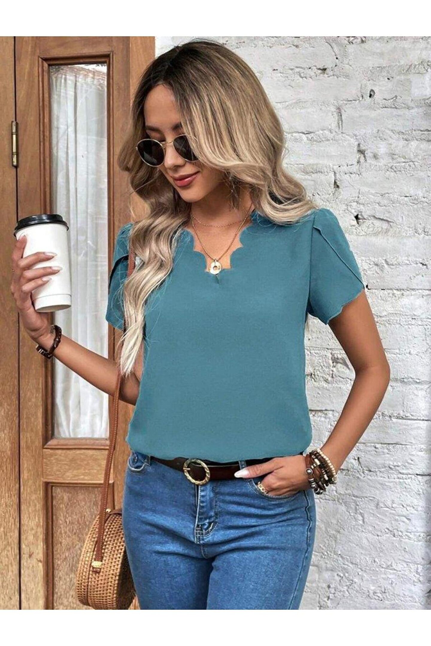 Kadın Kısa Kollu Lazer V Yakalı Ithal Krep Bluz