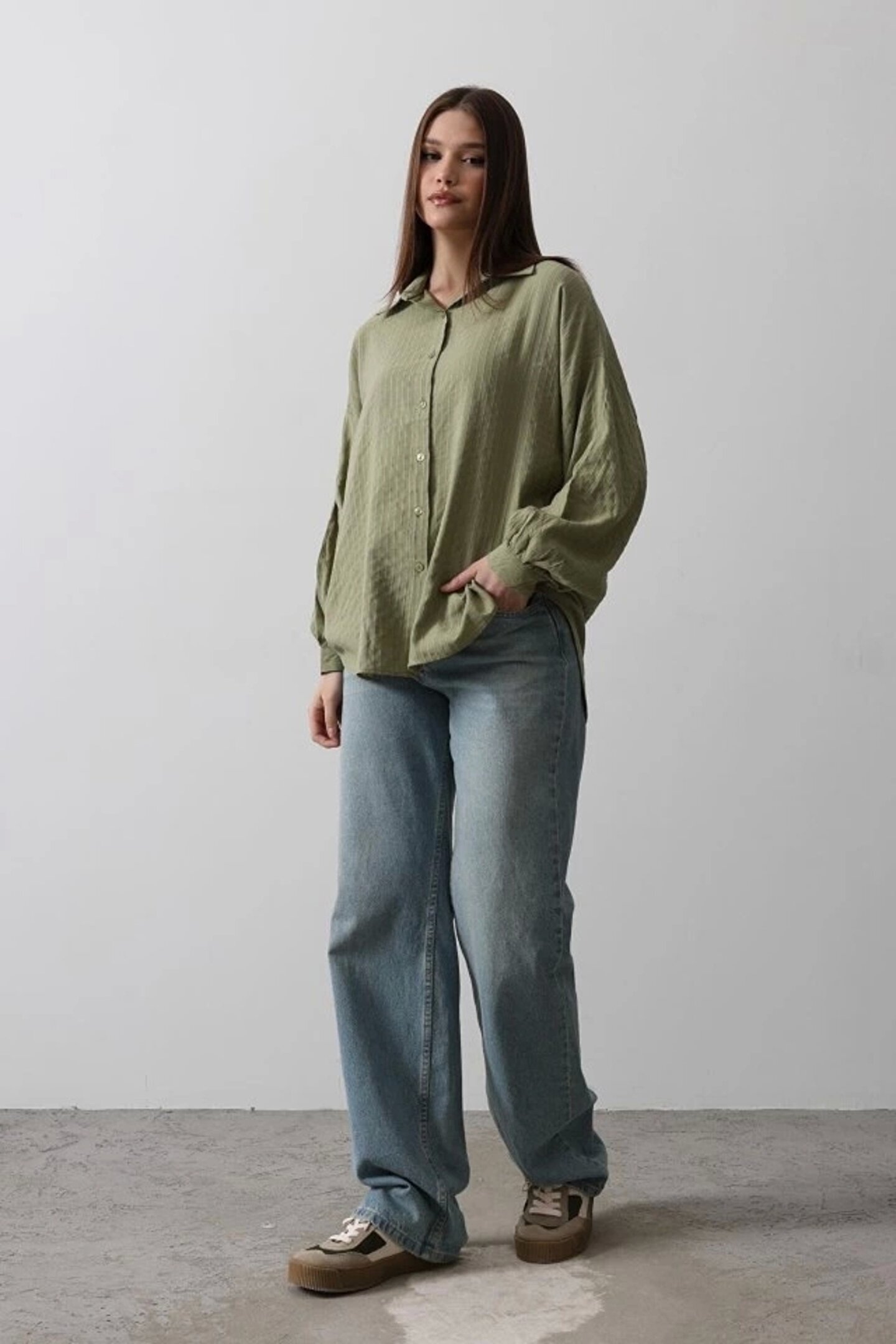Çizgili Uzun Kol Gömlek - Haki