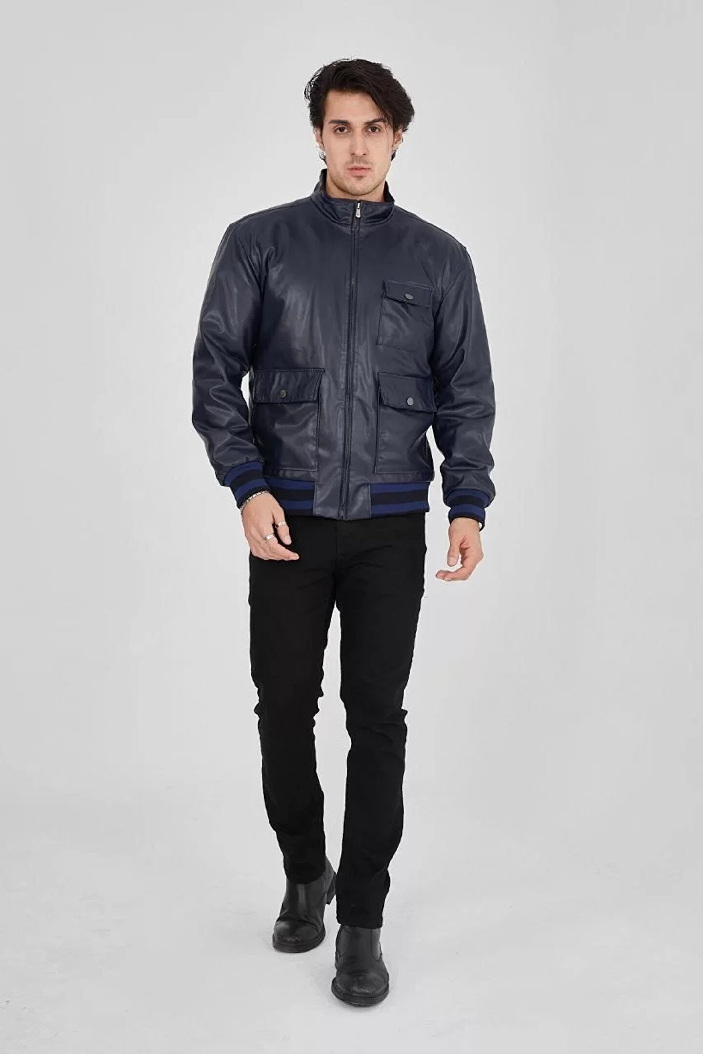 Erkek Fermuarlı İçten Elyaf ve Astarlı Suni Deri Ceket - Lacivert
