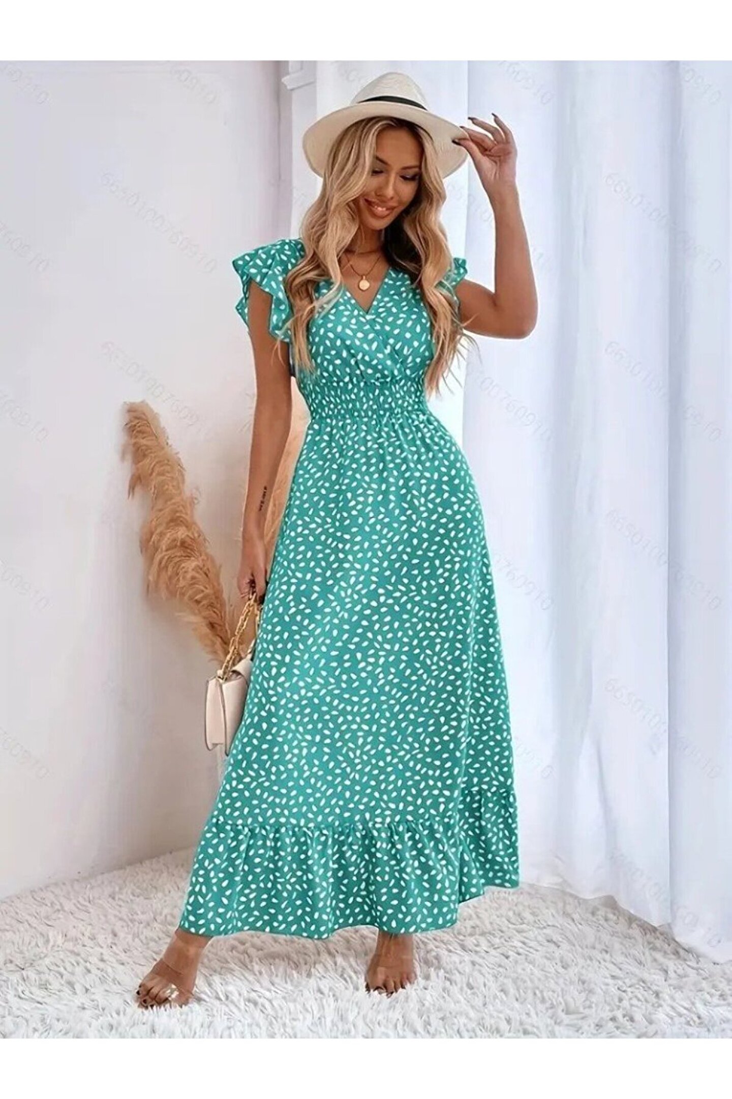 popibutik Desenli İnce Askılı Pembe Uzun Şifon Elbise