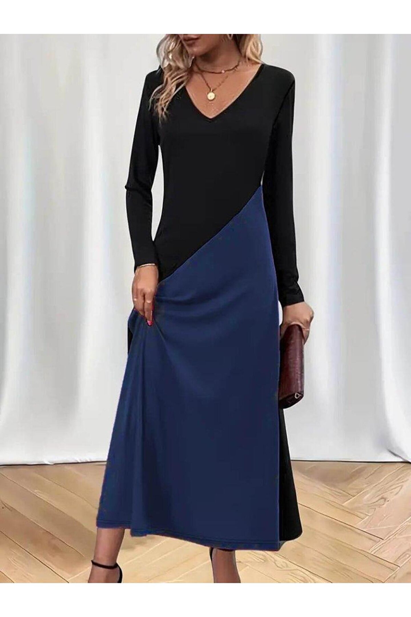 Kadın Uzun Kollu V Yakalı Blok Desenli Viskon Elbise