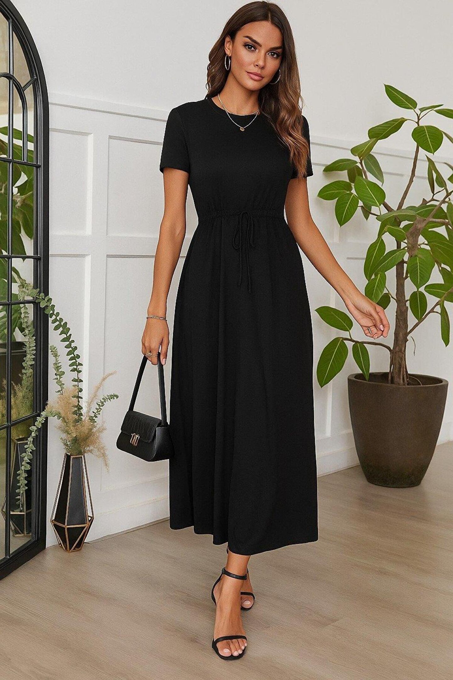Kadın Kısa Kollu Bisiklet Yaka Belden Bağlamalı önü Bağcık Detaylı Maksi Boy Viskon Elbise