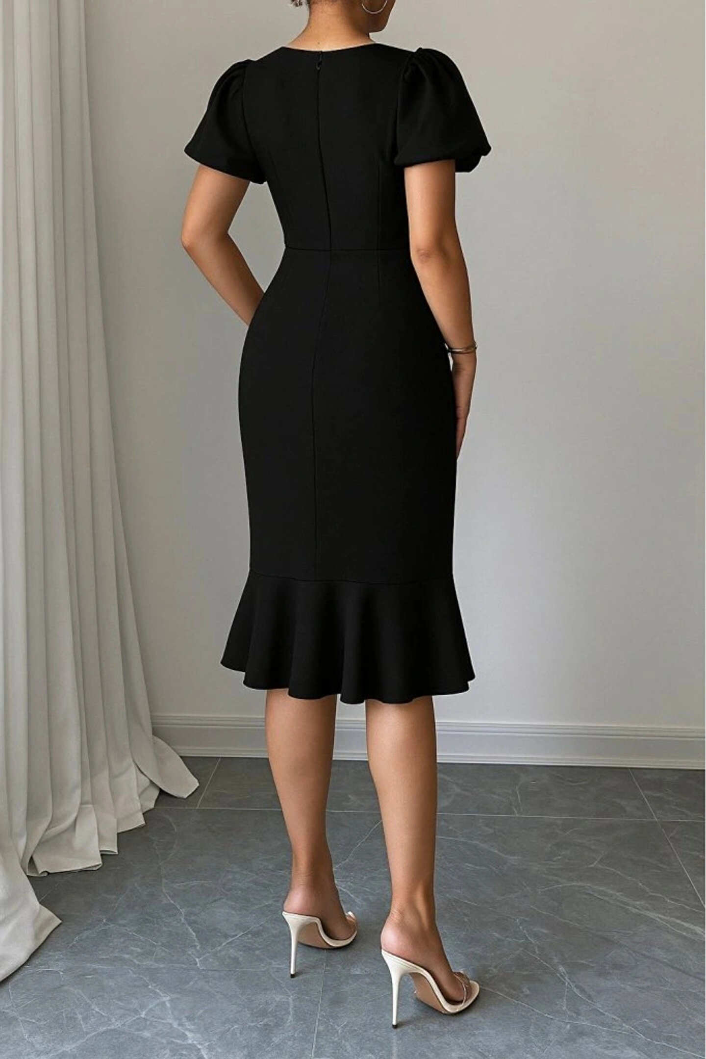 Kadın Kısa Kollu Yuvarlak Yaka Pileli Janjan Krep Elbise