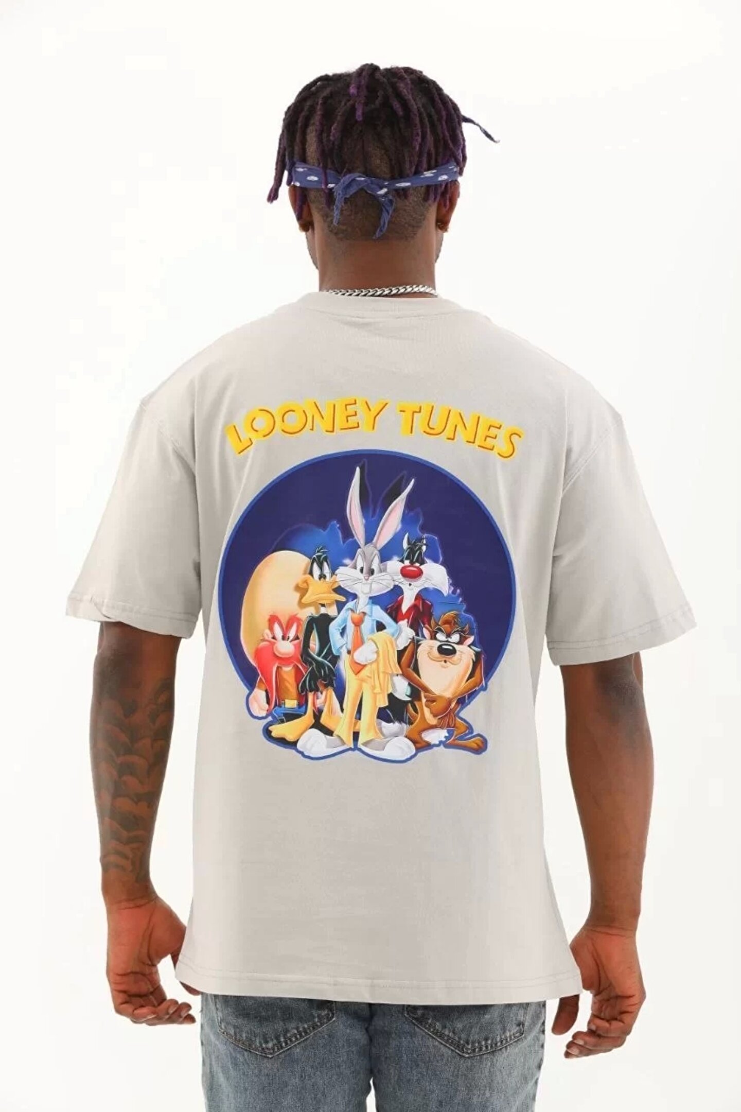 etol textile Unisex Oversize Baskılı Bisiklet Yaka T-Shirt - Gri