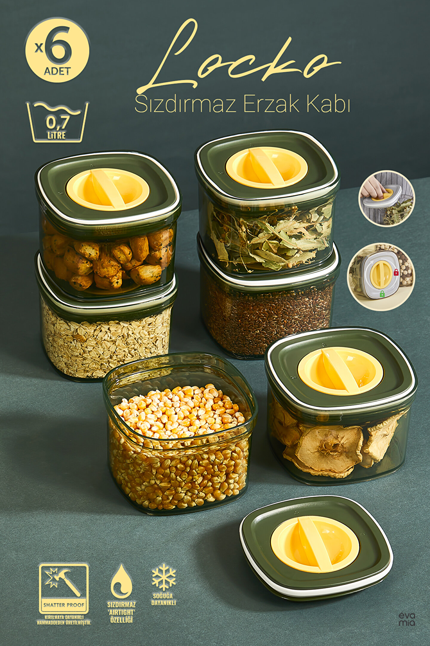 Eva Mia 6x Adet Yeşil Locko Sızdırmaz Saklama Kabı 0,7LT & Erzak Kabı & Bakliyat Kabı